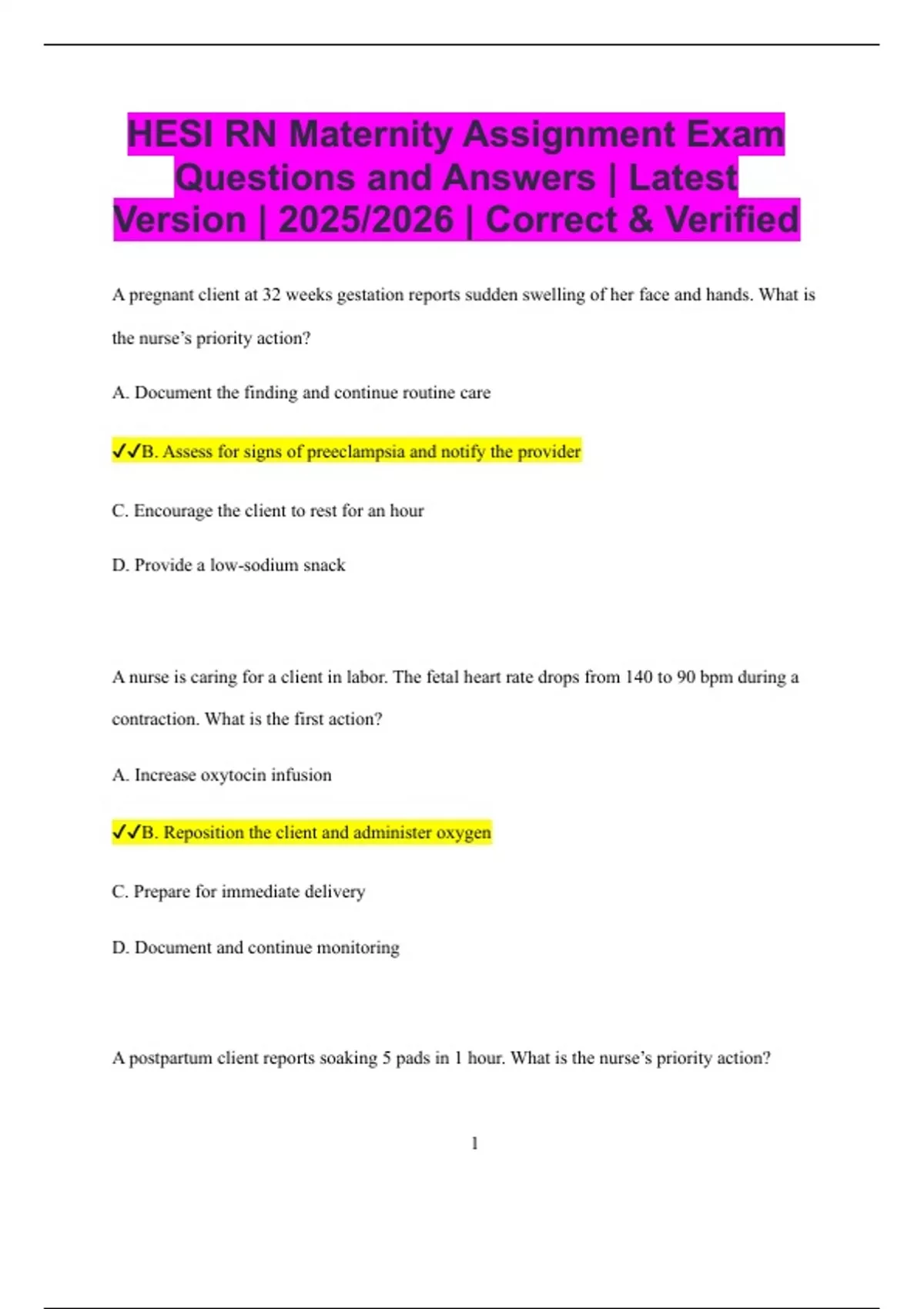 HESI RN Maternity Assignment Exam Questions and Answers | Latest Version | 2025/2026 | Correct & Verified A pregnant client at 32 weeks gestation reports sudden swelling of her face and hands. What is the nurse’s priority action? A. Document the finding and continue routine care B. Assess for signs of preeclampsia and notify the provider C. Encourage the client to rest for an hour D. Provide a low-sodium snack A nurse is caring for a client in labor. The fetal heart rate drops from 140 to 90 bpm during a contraction. What is the first action? A. Increase oxytocin infusion B. Reposition the client and administer oxygen C. Prepare for immediate delivery D. Document and continue monitoring A postpartum client reports soaking 5 pads in 1 hour. What is the nurse’s priority action? 2 A. Encourage oral fluids B. Continue routine observation C. Assess for postpartum hemorrhage D. Notify the dietary department A nurse is teaching a client about breastfeeding. Which statement indicates correct understanding? A. “Formula should be given first before breastfeeding.” B. “Feed my baby whenever it shows signs of hunger.” C. “I should avoid feeding on demand.” D. “Only feed every 4–5 hours.” A client at 28 weeks gestation reports severe headache and blurred vision. What should the nurse do first? A. Ask the client to rest B. Assess blood pressure and notify the provider immediately C. Offer water and a snack D. Document the complaint 3 A nurse is assessing a newborn 1 minute after birth. Which finding requires immediate intervention? A. Crying and moving all extremities B. Heart rate of 70 bpm C. Pink skin with acrocyanosis D. Strong reflexes A laboring client receiving epidural anesthesia reports hypotension. What is the nurse’s first action? A. Continue monitoring B. Place client in left lateral position and administer IV fluids C. Encourage the client to breathe deeply D. Raise the head of the bed A client at 36 weeks gestation reports decreased fetal movement. What is the best nursing action? A. Schedule a routine prenatal visit next week B. Perform fetal kick count and notify provider if decreased 4 C. Encourage walking for exercise D. Reassure the client without assessment A postpartum client asks about pain relief during breastfeeding. Which statement is correct? A. Avoid all medications while breastfeeding B. Only use herbal remedies C. Acetaminophen or ibuprofen are safe if prescribed D. Take opioid medications as needed without consultation A newborn has a temperature of 36.0°C (96.8°F). What is the priority intervention? A. Swaddle the newborn and monitor temperature B. Initiate skin-to-skin contact and warm the infant C. Document and recheck in 4 hours D. Delay feeding until temperature normalizes A client in labor has contractions every 2 minutes and fetal heart rate decelerations. What is the nurse’s priority action? A. Increase IV fluids 5 B. Continue monitoring C. Notify the provider immediately for potential