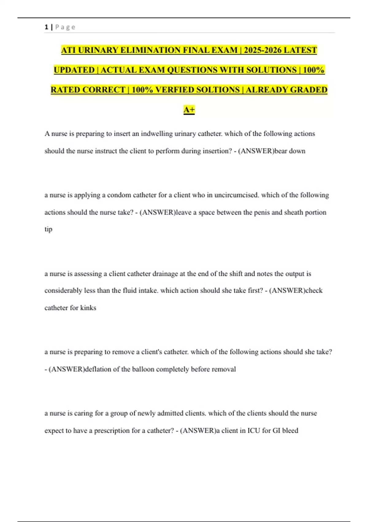 ATI URINARY ELIMINATION FINAL EXAM | LATEST UPDATED | ACTUAL EXAM QUESTIONS WITH SOLUTIONS | 100% RATED CORRECT | 100% VERFIED SOLTIONS | ALREADY GRADED A+