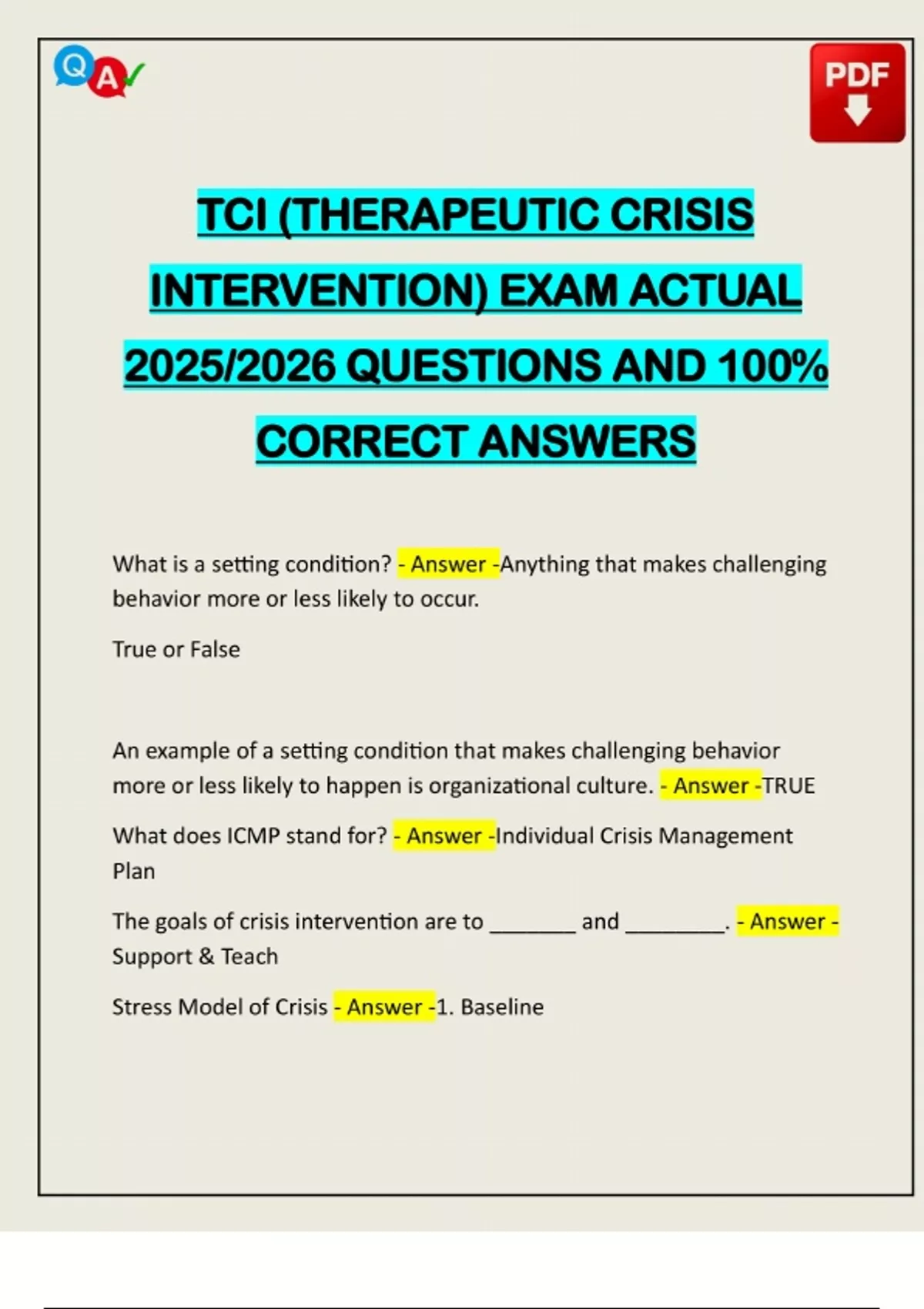 TCI (THERAPEUTIC CRISIS INTERVENTION) EXAM ACTUAL 2025/2026 QUESTIONS AND 100% CORRECT ANSWERS What is a setting condition? - Answer -Anything that makes challenging behavior more or less likely to occur. True or False An example of a setting condition that makes challenging behavior more or less likely to happen is organizational culture. - Answer -TRUE What does ICMP stand for? - Answer -Individual Crisis Management Plan The goals of crisis intervention are to _______ and ________. - Answer - Support & Teach Stress Model of Crisis - Answer -1. BaselineNeed assistance in Online classes, Exams & Assignments? Reach out for Full Course Assistance, Plagiarism-free Essay Writing, Research Paper & Discussion Posts. Confidential & Secure! Email now at: 2. Triggering Event 3. Escalation Phase 4. Outburst Crisis 5. Recovery What are the four questions that we ask ourselves before intervening in a potential crisis? - Answer -1. What a
