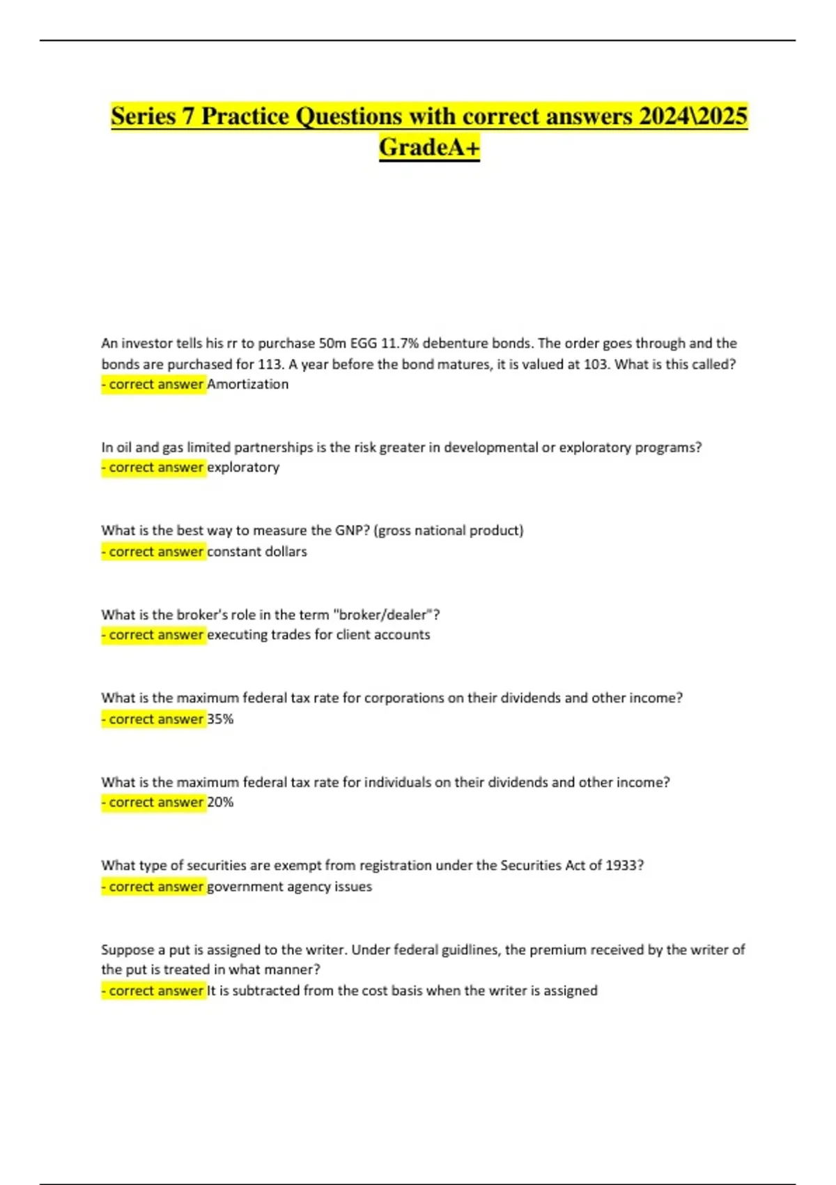 This document provides a comprehensive set of FINRA Series 7 practice questions with correct answers, fully updated for the 2024/2025 exam cycle. It covers essential Series 7 exam topics such as equities, bonds, mutual funds, options, regulatory framework, and customer account management. Structured to reflect the real exam format, this resource is ideal for candidates preparing to earn their General Securities Representative license.