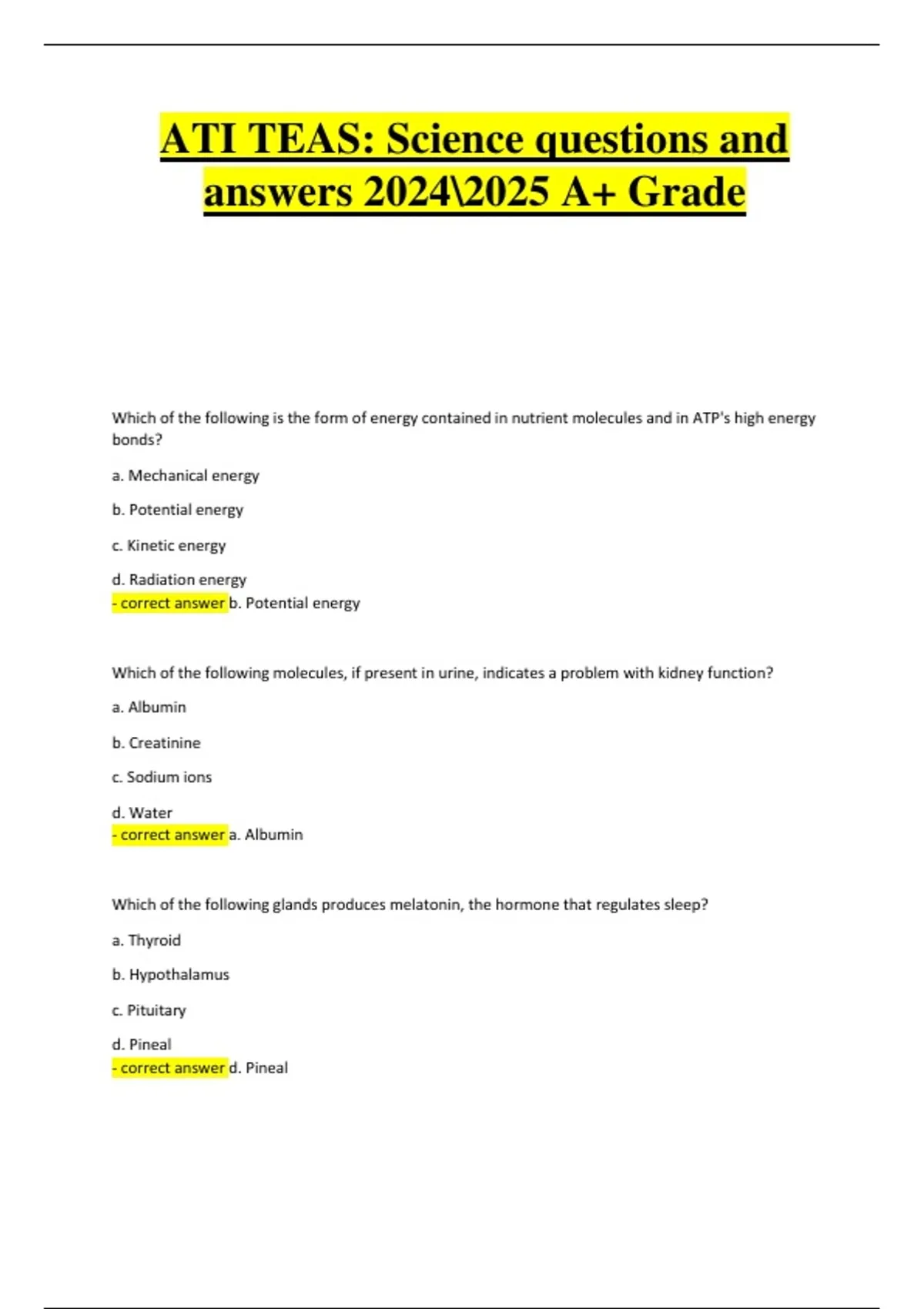 This document provides a comprehensive collection of ATI TEAS science questions with correct answers for the 2024/2025 exam. It covers major topics including human anatomy and physiology, biology, chemistry, and scientific reasoning. The content is designed to support students in mastering the science section of the TEAS exam with accurate and exam-focused practice.
