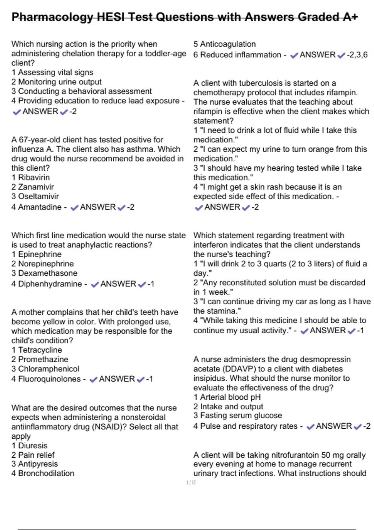 , Pharmacology HESI Test Questions with Answers Graded A+