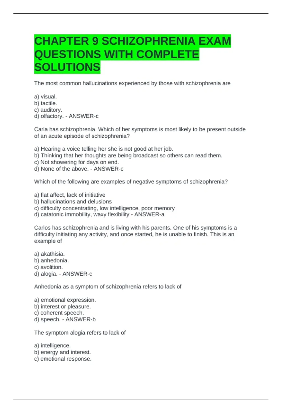 CHAPTER 9 SCHIZOPHRENIA EXAM