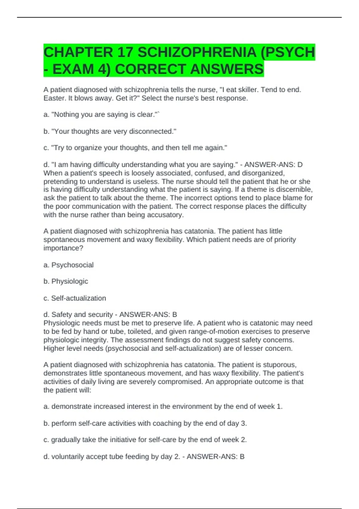 CHAPTER 17 SCHIZOPHRENIA (PSYCH - EXAM 4) CORRECT ANSWERS