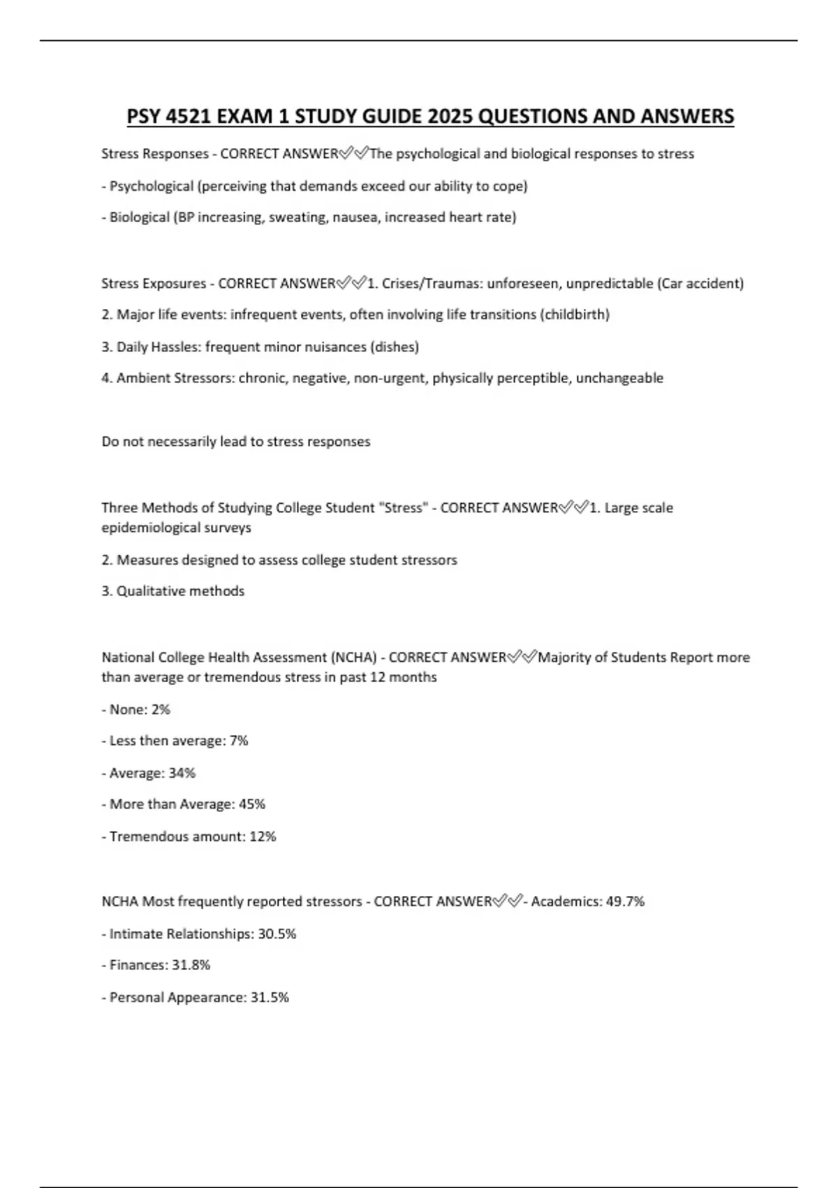 PSY 4521 EXAM 1 STUDY GUIDE 2025 QUESTIONS AND ANSWERS Stress Responses - CORRECT ANSWERThe psychological and biological responses to stress - Psychological (perceiving that demands exceed our ability to cope) - Biological (BP increasing, sweating, nausea, increased heart rate)