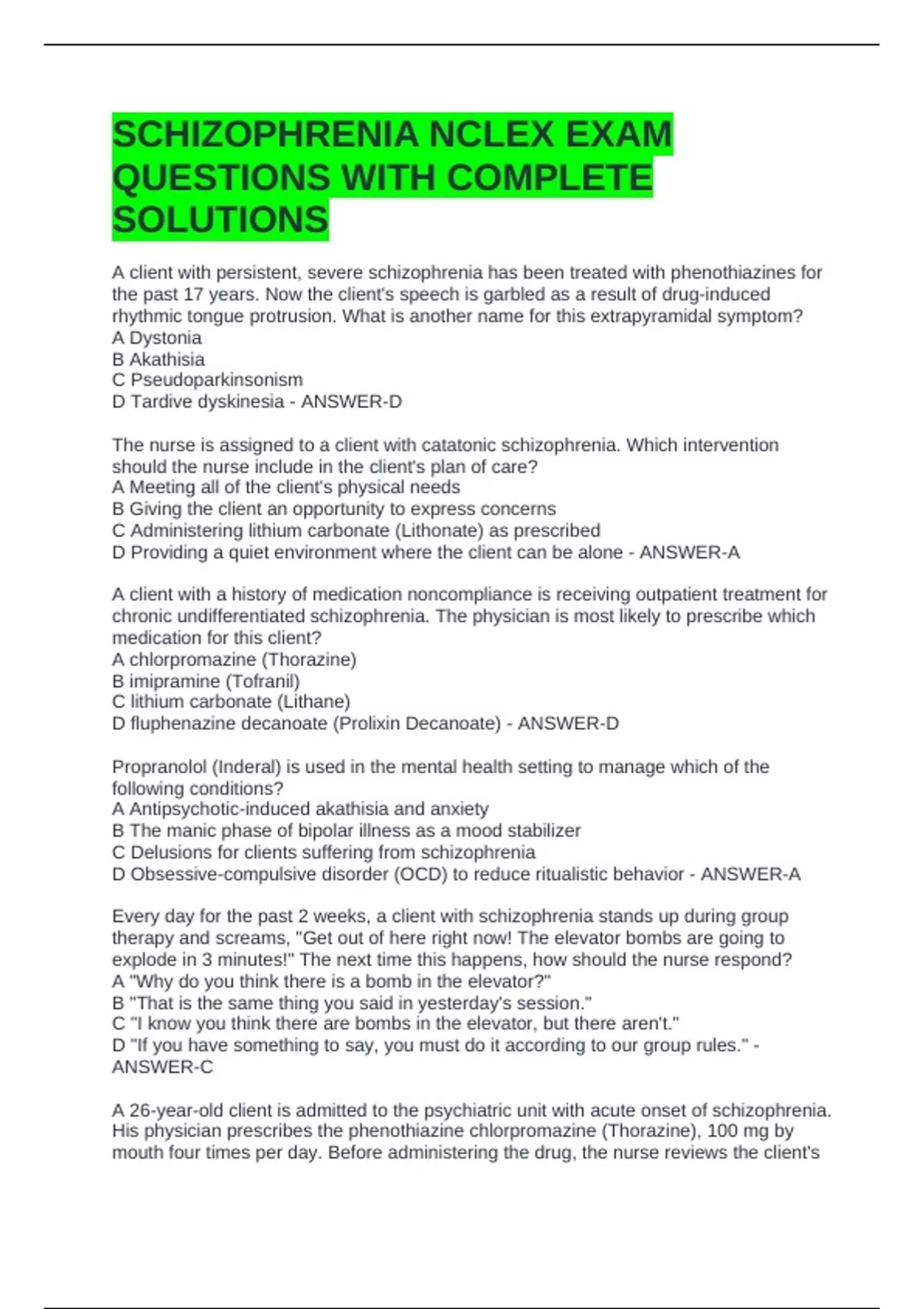SCHIZOPHRENIA NCLEX EXAM