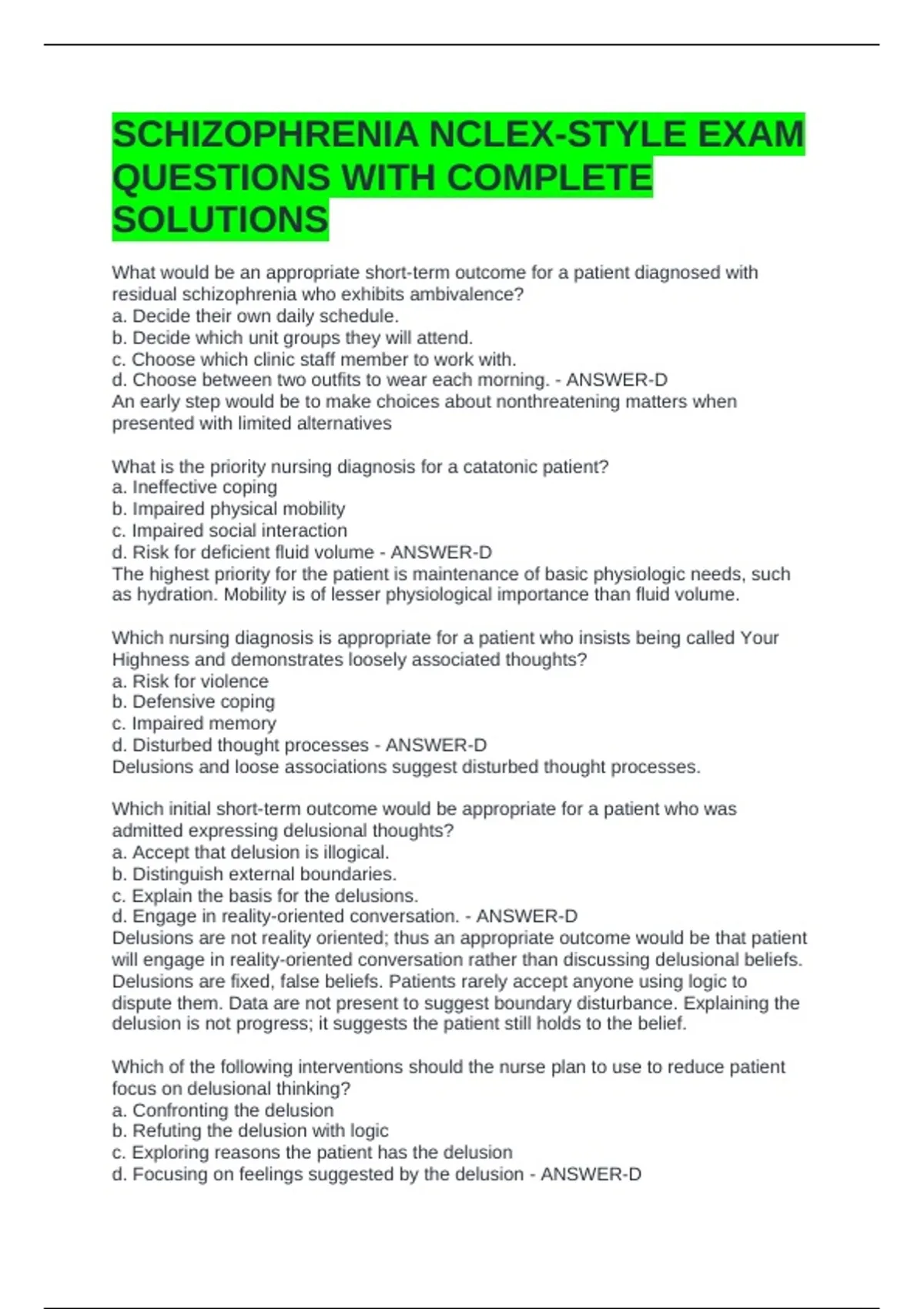 SCHIZOPHRENIA NCLEX-STYLE EXAM QUESTIONS WITH COMPLETE SOLUTIONS