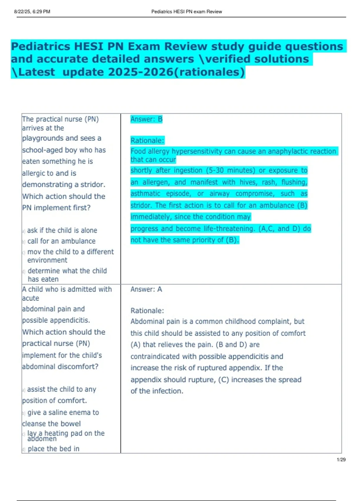 , 8/22/25, 6:29 PM Pediatrics HESI PN exam Review