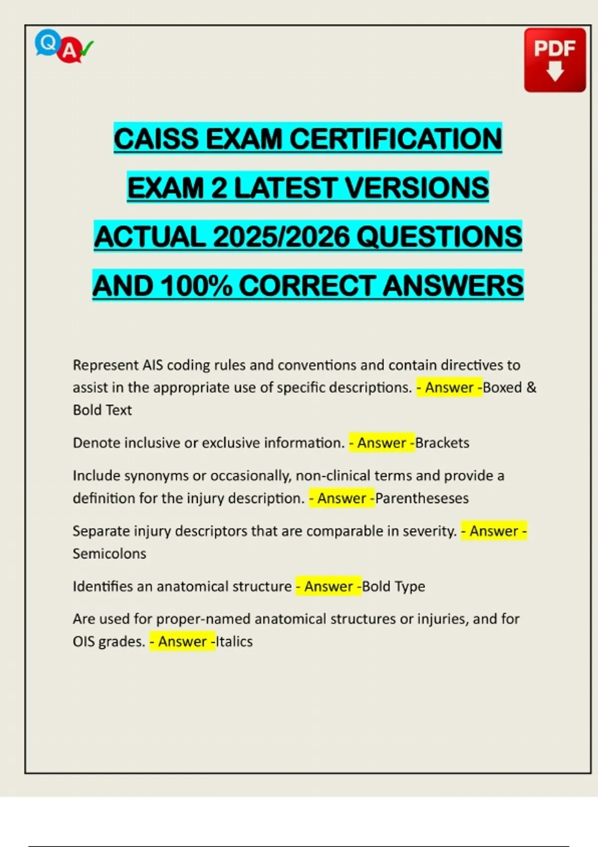 CAISS EXAM CERTIFICATION EXAM 2 LATEST VERSIONS ACTUAL 2025/2026 QUESTIONS AND 100% CORRECT ANSWERS Represent AIS coding rules and conventions and contain directives to assist in the appropriate use of specific descriptions. - Answer -Boxed & Bold Text Denote inclusive or exclusive information. - Answer -Brackets Include synonyms or occasionally, non-clinical terms and provide a definition for the injury description. - Answer -Parentheseses Separate injury descriptors that are comparable in severity. - Answer - Semicolons Identifies an anatomical structure - Answer -Bold Type Are used for proper-named anatomical structures or injuries, and for OIS grades. - Answer -ItalicsNeed assistance in Online classes, Exams & Assignments? Reach out for Full Course Assistance, Plagiarism-free Essay Writing, Research Paper & Discussion Posts. Confidential & Secure! Email now at: Minor - Answer -AIS .1 Moderate - Answer -AIS .2 Serious - Answer -AIS .3 Severe - Answer -AIS .4 Critical - Answer -AIS .5 Maximum - Answer -AIS .6 1-6 - Answer -Range of AIS se