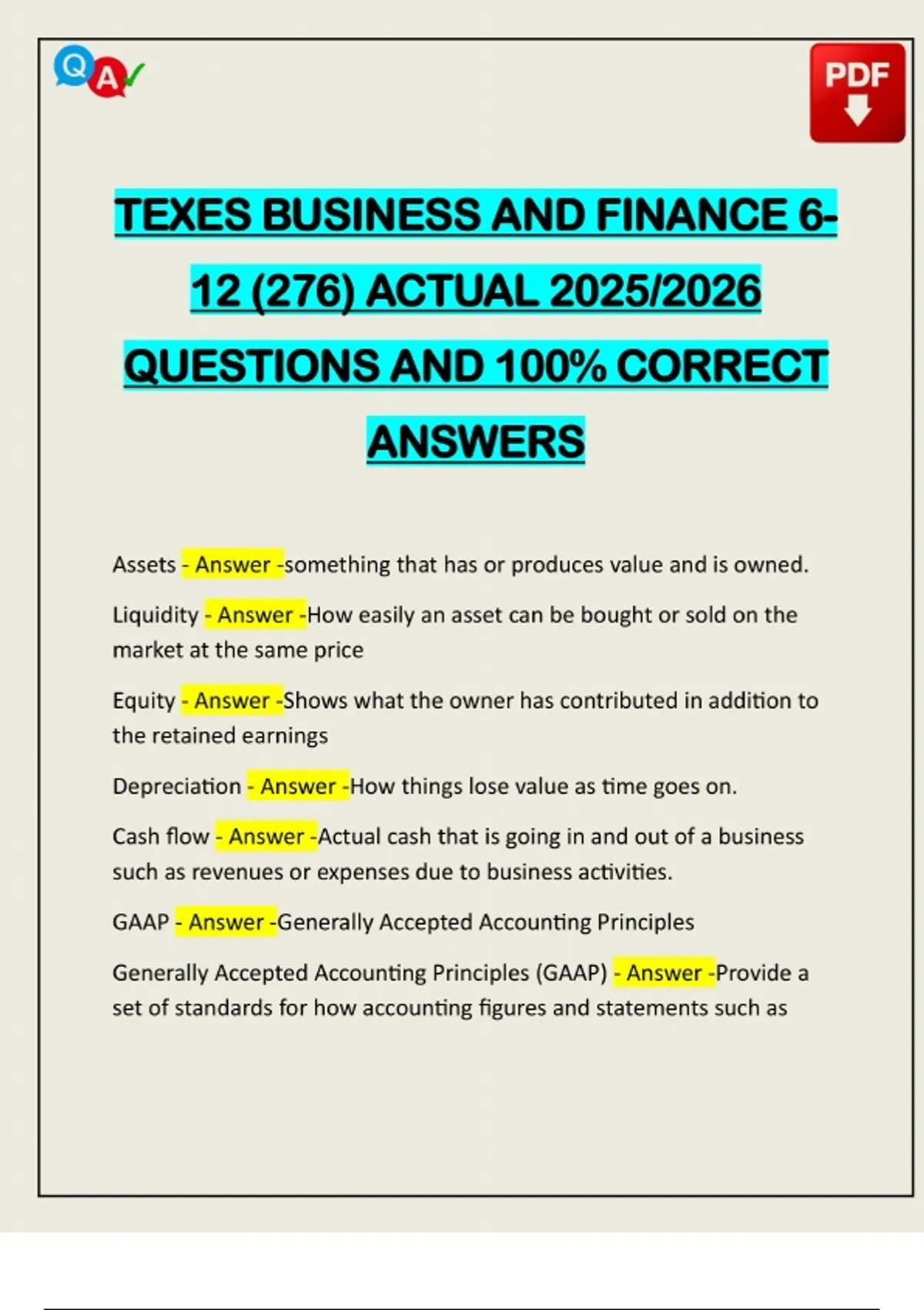 TEXES BUSINESS AND FINANCE 6- 12 (276) ACTUAL 2025/2026 QUESTIONS AND 100% CORRECT ANSWERS Assets - Answer -something that has or produces value and is owned. Liquidity - Answer -How easily an asset can be bought or sold on the market at the same price Equity - Answer -Shows what the owner has contributed in addition to the retained earnings Depreciation - Answer -How things lose value as time goes on. Cash flow - Answer -Actual cash that is going in and out of a business such as revenues or expenses due to business activities. GAAP - Answer -Generally Accepted Accounting Principles Generally Accepted Accounting Principles (GAAP) - Answer -Provide a set of standards for how accounti