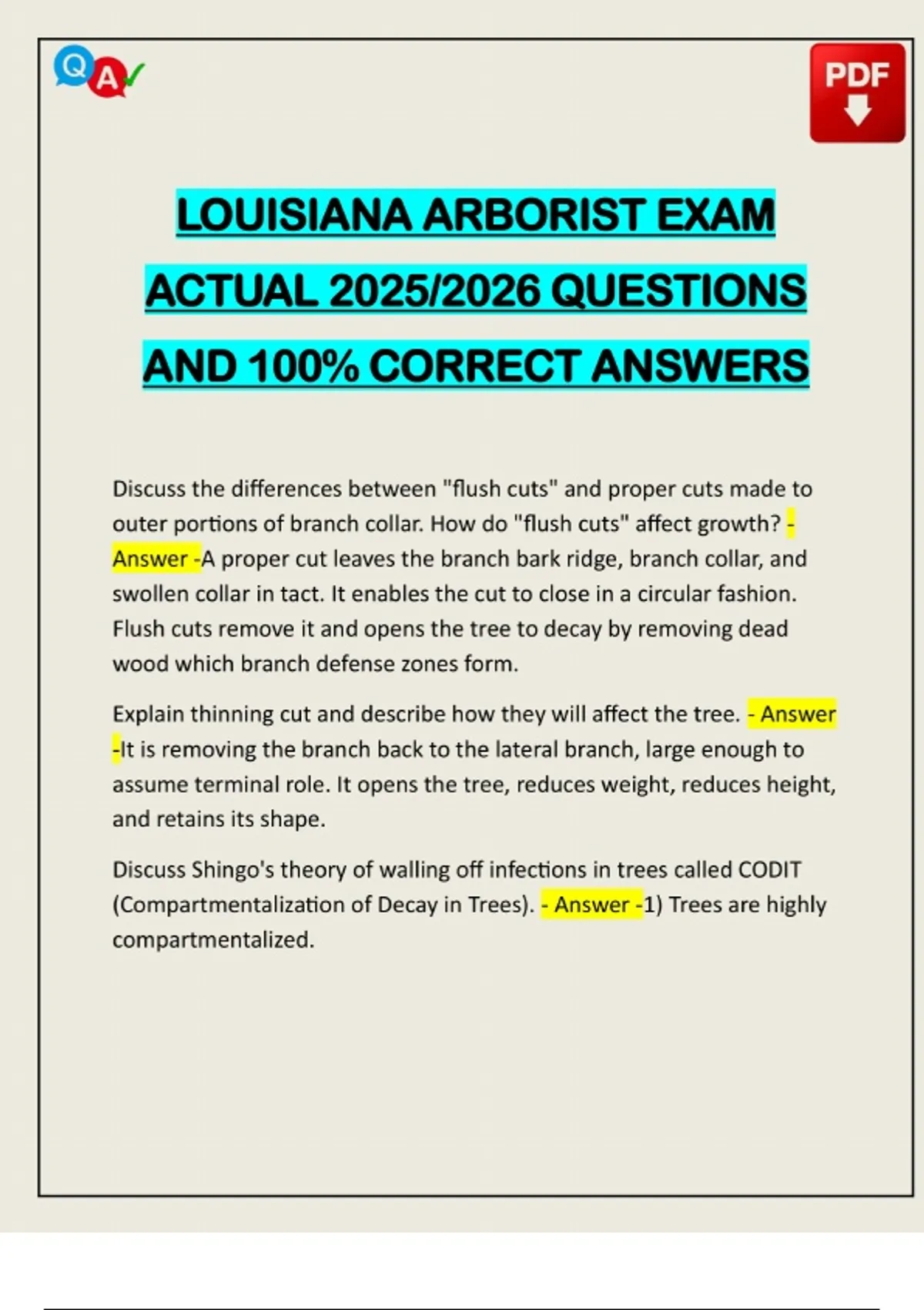 LOUISIANA ARBORIST EXAM ACTUAL 2025/2026 QUESTIONS AND 100% CORRECT ANSWERS Discuss the differences between "flush cuts" and proper cuts made to outer portions of branch collar. How do "flush cuts" affect growth? - Answer -A proper cut leaves the branch bark ridge, branch collar, and swollen collar in tact. It enables the cut to close in a circular fashion. Flush cuts remove it and opens the tree to decay by removing dead wood which branch defense zones form. Explain thinning cut and describe how they will affect the tree. - Answer -It is removing the branch back to the lateral branch, large enough to assume terminal role. It opens the tree, reduces weight, reduces height, and retains its shape. Discuss Shingo's theory of walling off infections in trees called CODIT (Compartmentalization of Decay in Trees). - Answer -1) Trees are highly compartmentalized.Need assistance in Online classes, Exams & Assignments? Reach out for Full Course Assistance, Plagiarism-free Essay Writing, Research Paper & Discussion Posts. Confidential & Secure! Email now at: 2) If the tree is wounded, it will heal itself by walling itself off from injury. How will pruning a tree at time of transplanting affect tree growth? - Answer -It decreases root growth. You should avoid pruning except for broken or damaged limbs. Are there advantages of pruning a tree at pla