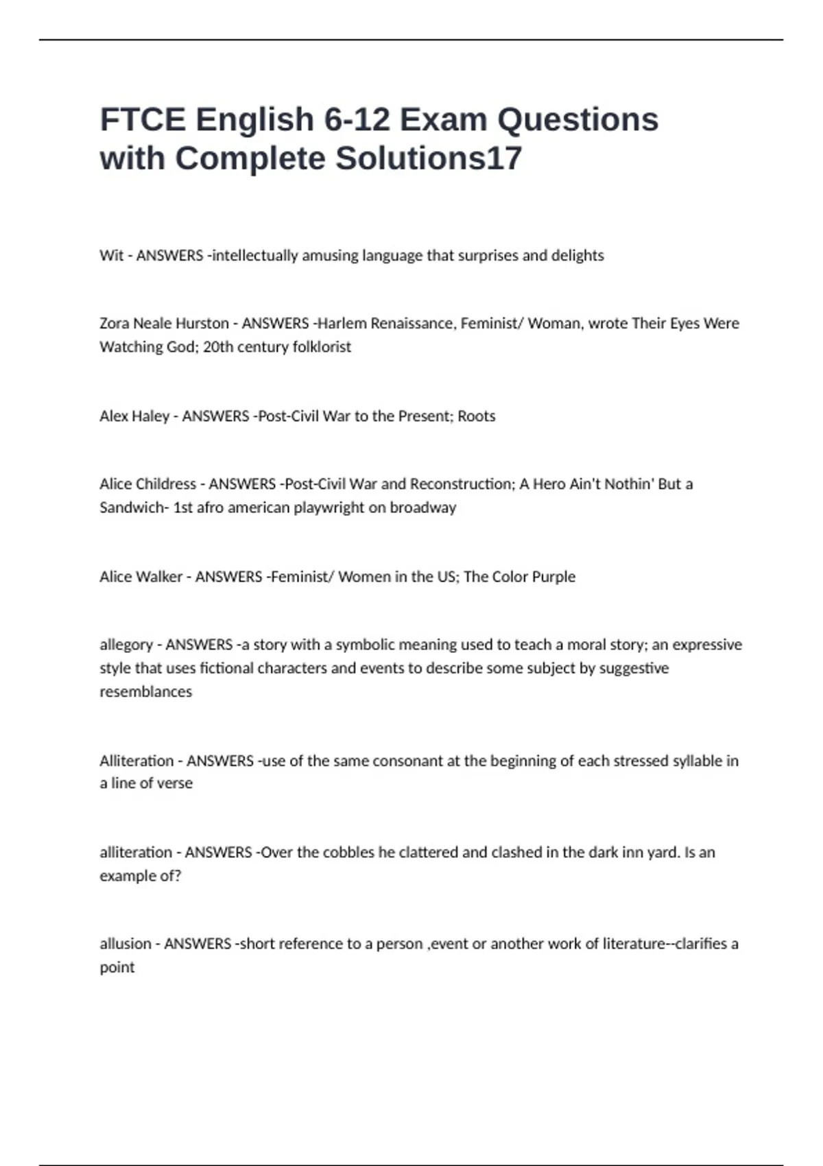 allusion - ANSWERS -short reference to a person ,event or another work of literature--clarifies a