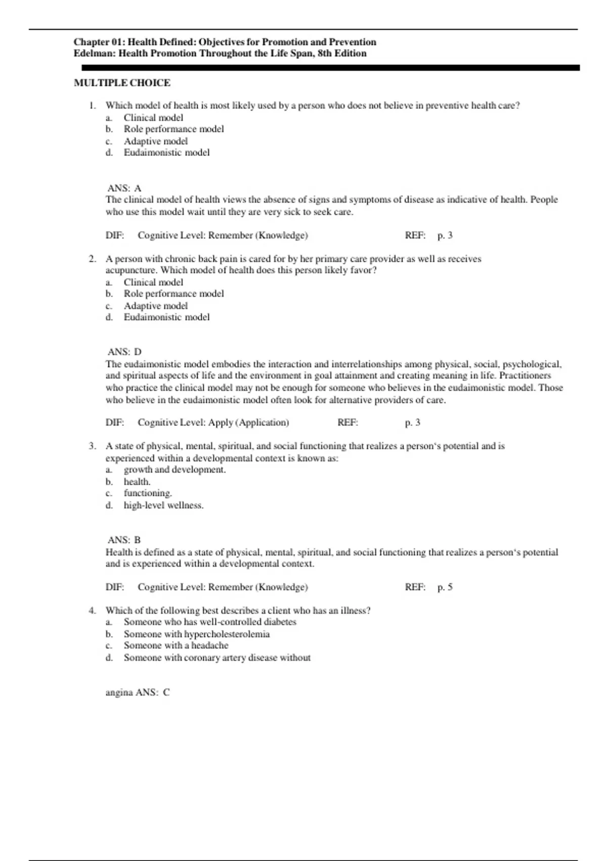TEST BANK FOR HEALTH PROMOTION THROUGHOUT THE LIFE SPAN, 8TH EDITION BY CAROLE EDELMAN