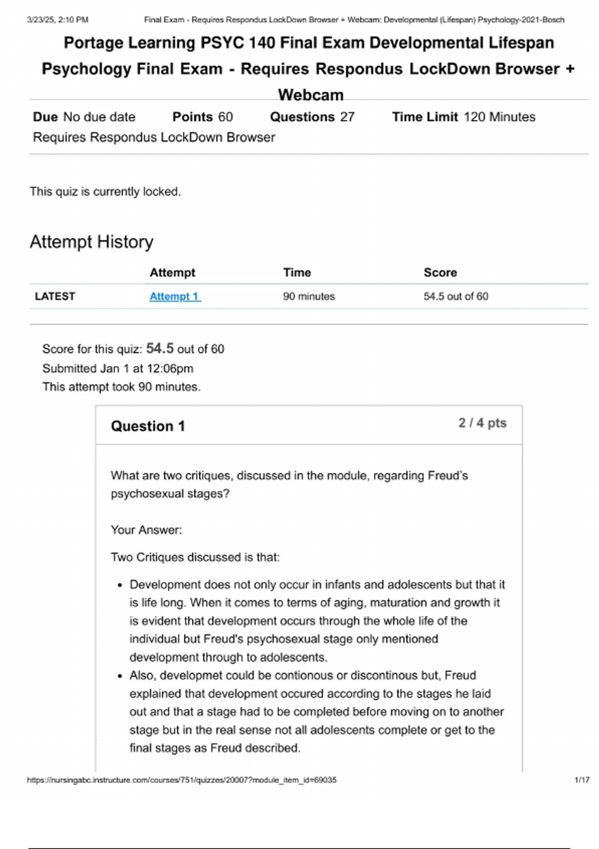 Portage Learning PSYC 140 Final Exam 2025/2026 Developmental Lifespan Psychology Final Exam - Requires Respondus LockDown Browser + Webcam Score for this quiz: 54.5 out of 60 Submitted Jan 1 at 12:06pm This attempt took 90 minutes. Question 1 2 / 4 pts Your Answer: What are two critiques, discussed in the module, regarding Freud’s psychosexual stages? Two Critiques discussed is that: Development does not only occur in infants and adolescents but that it is life long. When it comes to terms of aging, maturation and growth it is evident that development occurs through the whole life of the individual but Freud's psychosexual stage only mentioned development through to adolescents. Also, developmet could be contionous or discontinous but, Freud explained that development occured according to the stages he laid out and that a stage had to be completed before moving on to another stage but in the real sense not all adolescents complete or get to the final stages as Freud described