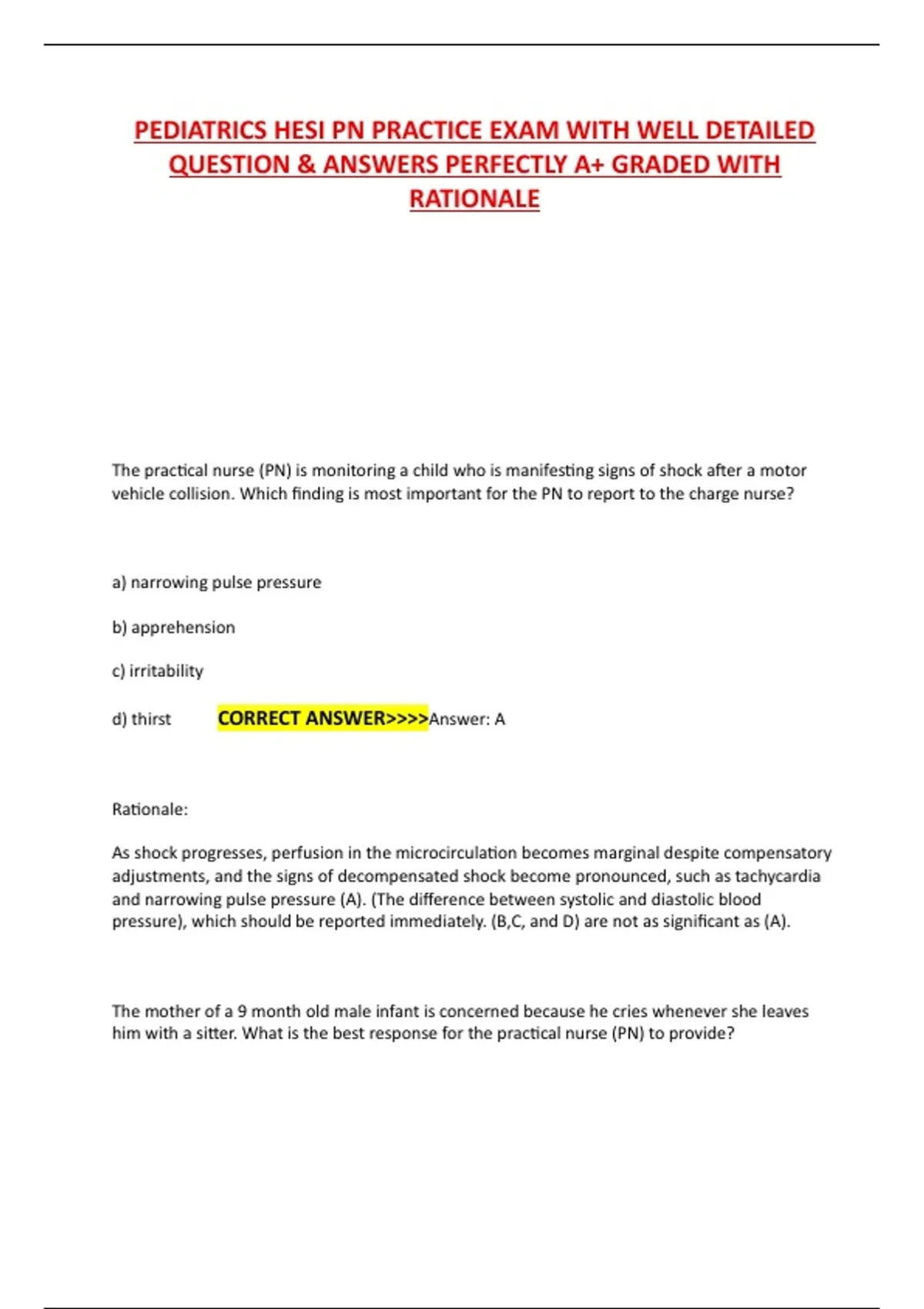 PEDIATRICS HESI PN PRACTICE EXAM WITH WELL DETAILED QUESTION & ANSWERS PERFECTLY A+ GRADED WITH RATIONALE PEDIATRICS HESI PN PRACTICE EXAM WITH WELL DETAILED QUESTION & ANSWERS PERFECTLY A+ GRADED WITH RATIONALE