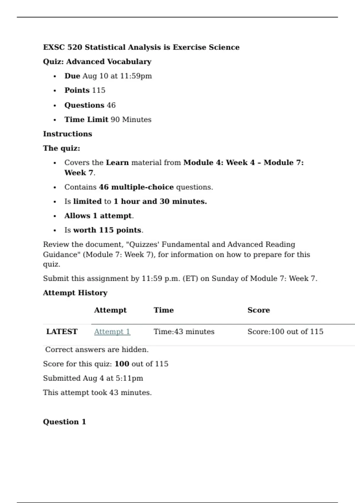 LATEST Attempt 1 Time:43 minutes Score:100 out of 115