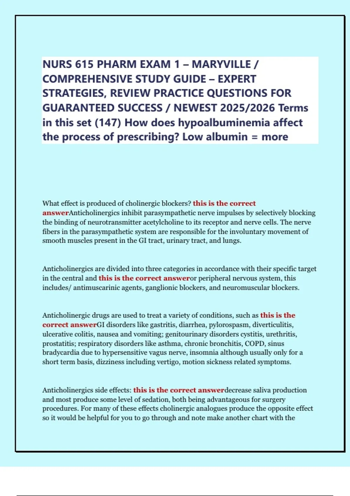 NURS 615 PHARM EXAM 1 – MARYVILLE / COMPREHENSIVE STUDY GUIDE – EXPERT STRATEGIES, REVIEW PRACTICE QUESTIONS FOR GUARANTEED SUCCESS / NEWEST 2025/2026 Terms in this set (147) How does hypoalbuminemia affect the process of prescribing? Low albumin = m