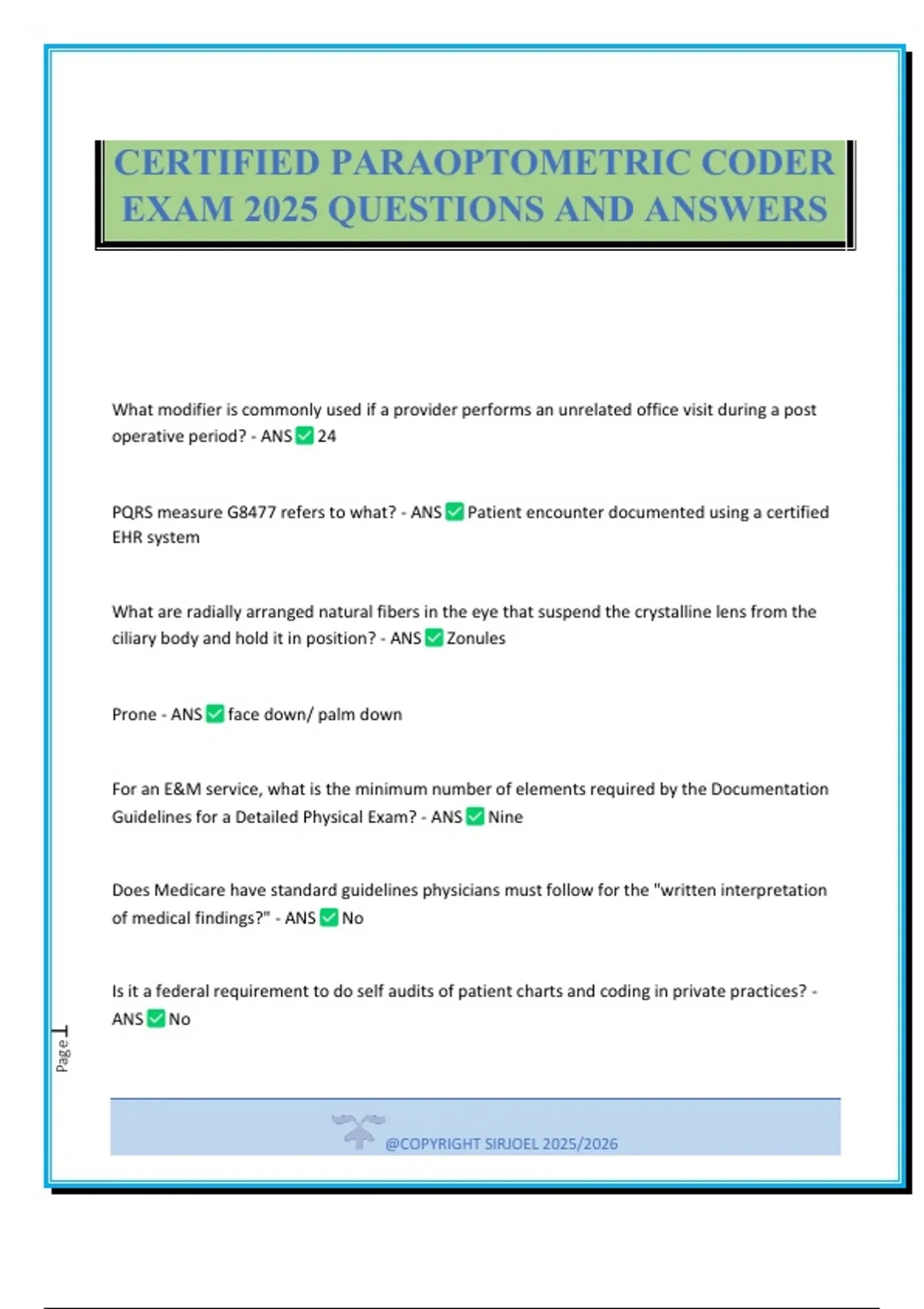 What modifier is commonly used if a provider performs an unrelated office visit during a post operative period? - ANS 24 PQRS measure G8477 refers to what? - ANS Patient encounter documented using a certified EHR system What are radially arranged natural fibers in the eye that suspend the crystalline lens from the ciliary body and hold it in position? - ANS Zonules Prone - ANS face down/ palm down For an E&M service, what is the minimum number of elements required by the Documentation Guidelines for a Detailed Physical Exam? - ANS Nine Does Medicare have standard guidelines physicians must follow for the "written interpretation of medical findings?" - ANS No Is it a federal requirement to do self audits of patient charts and coding in private practices? - ANS No CERTIFIED PARAOPTOMETRIC CODER EXAM 2025 QUESTIONS AND ANSWERS @COPYRIGHT SIRJOEL 2025/2026 Page2 -endo - ANS within coronal - ANS vertical body plain, divides the body into front & back sections -oid - ANS like supine - ANS face up/palm up What is an e-claim clearing house? - ANS A company that a provider contracts with to transmit claims legally and safely between the provider and the insurance companies What are surgically implanted plastic half rings that change the shape of the cornea? - ANS Intacs What is medical insurance? - ANS A written policy between the individual (policy holder) and health plan (payer) What is "QMB" Medicaid? - ANS Qualified Medicaid Beneficiary- limited benefits What are the four "E" modifiers used for? - ANS For indicating which lid is involved. E1= Upper left eyelid, E2= Lower left eyelid, E3= Upper right eyelid, E4= Lower right eyelid How many "E" modifiers are there? - ANS 4 On the CMS 1