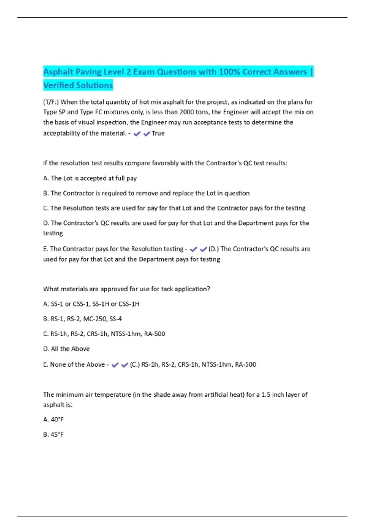 Asphalt Paving Level 2 Exam Questions with 100% Correct Answers | Verified Solutions