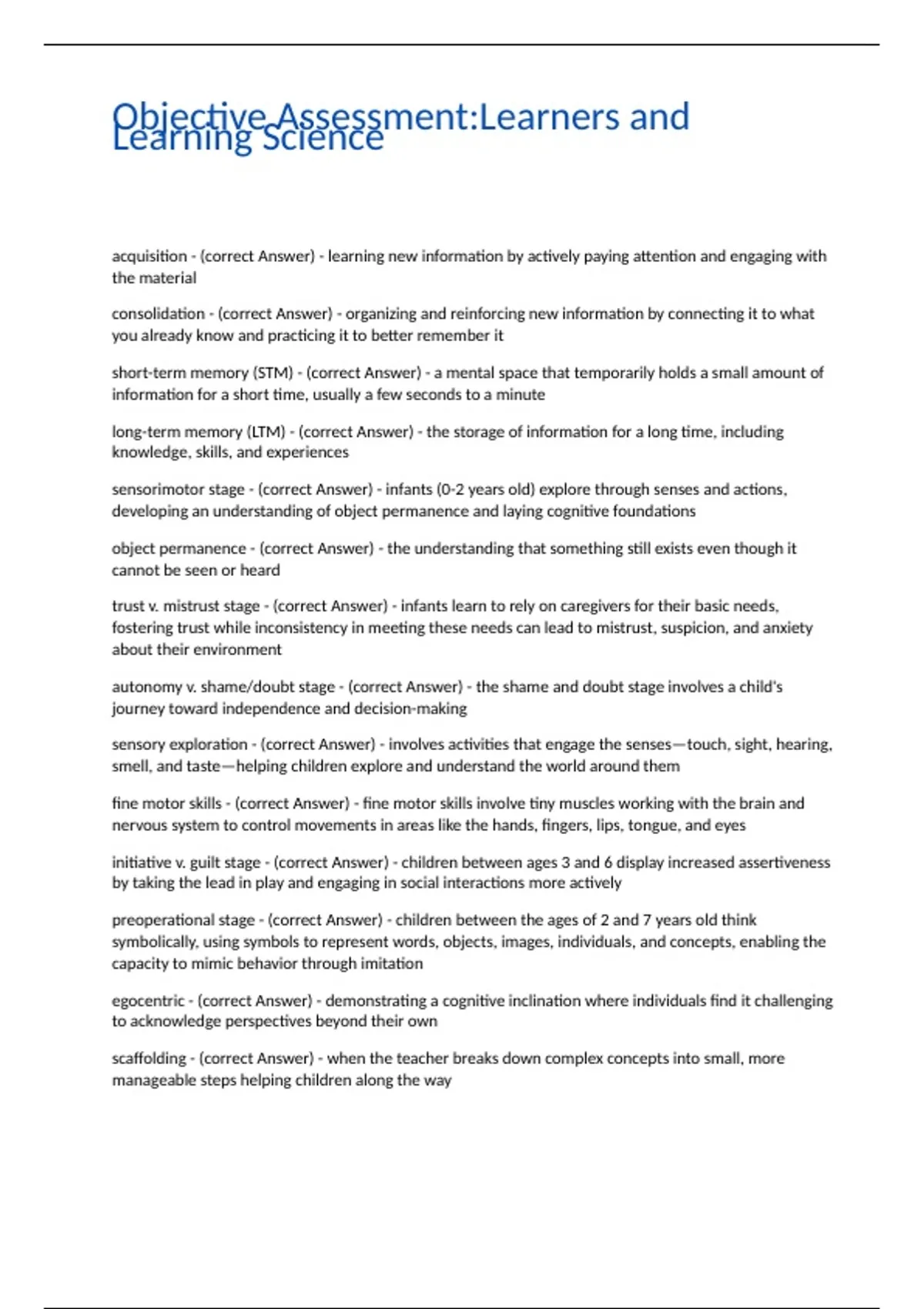 sensorimotor stage - (correct Answer) - infants (0-2 years old) explore through senses and actions,