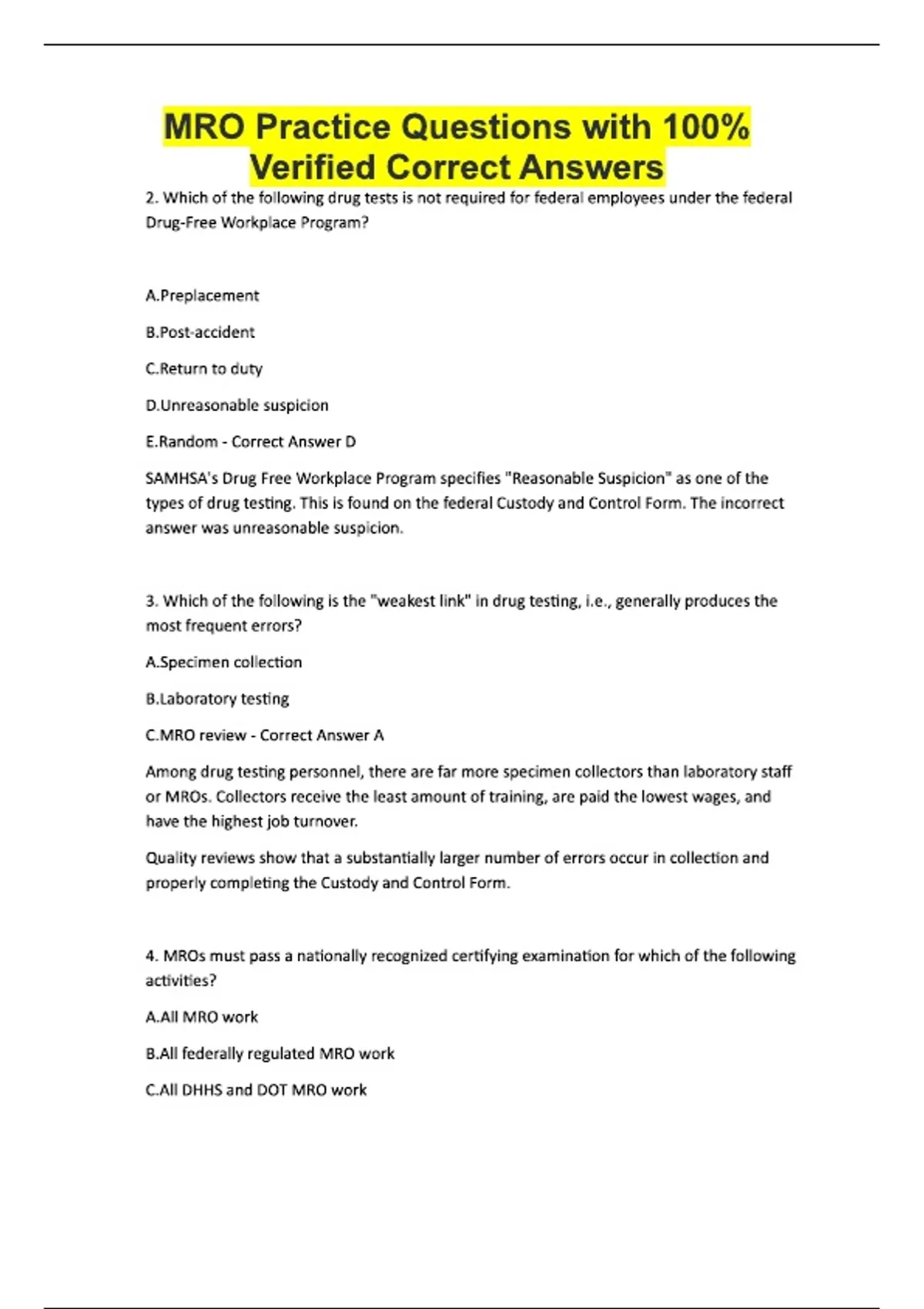 MRO Practice Questions with 100% Verified Correct Answers 2. Which of the following drug tests is not required for federal employees under the federal Drug-Free Workplace Program? A.Preplacement B.Post-accident C.Return to duty D.Unreasonable suspicion E.Random - Correct Answer D SAMHSA's Drug Free Workplace Program specifies "Reasonable Suspicion" as one of the types of drug testing. This is found on the federal Custody and Control Form. The incorrect answer was unreasonable suspicion. 3. Which of the following is the "weakest link" in drug testing, i.e., generally produces the most frequent errors? A.Specimen collection B.Laboratory testing C.MRO review - Correct Answer A Among drug testing personnel, there are far more specimen collectors than laboratory staff or MROs. Collectors receive the least amount of training, are paid the lowest wages, and have the highest job turnover. Quality reviews show that a substantially larger number of errors occur in collection and properly completing the Custody and Control Form. 4. MROs must pass a nationally recognized certifying examination for which of the following activities? A.All MRO work B.All federally regulated MRO work C.All DHHS and DOT