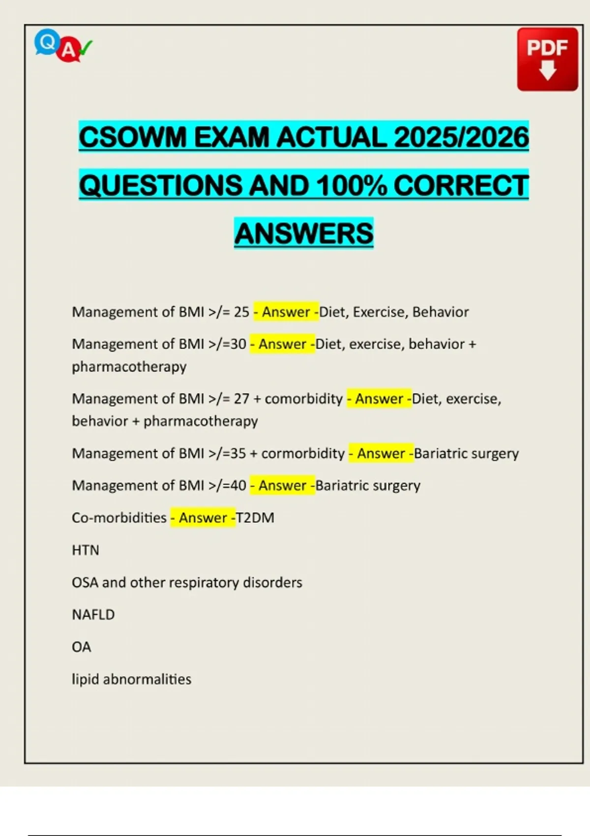 CSOWM EXAM ACTUAL 2025/2026 QUESTIONS AND 100% CORRECT ANSWERS Management of BMI >/= 25 - Answer -Diet, Exercise, Behavior Management of BMI >/=30 - Answer -Diet, exercise, behavior + pharmacotherapy Management of BMI >/= 27 + comorbidity - Answer -Diet, exercise, behavior + pharmacotherapy Management of BMI >/=35 + cormorbidity - Answer -Bariatric surgery Management of BMI >/=40 - Answer -Bariatric surgery Co-morbidities - Answer -T2DM HTN OSA and other respiratory disorders NAFLD