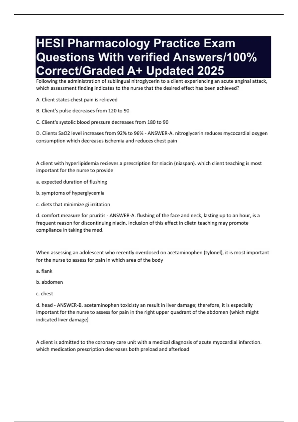 d. captopril - ANSWER-A. nitroglycerin is a nitrate that causes peripheral vasodilation and decreases