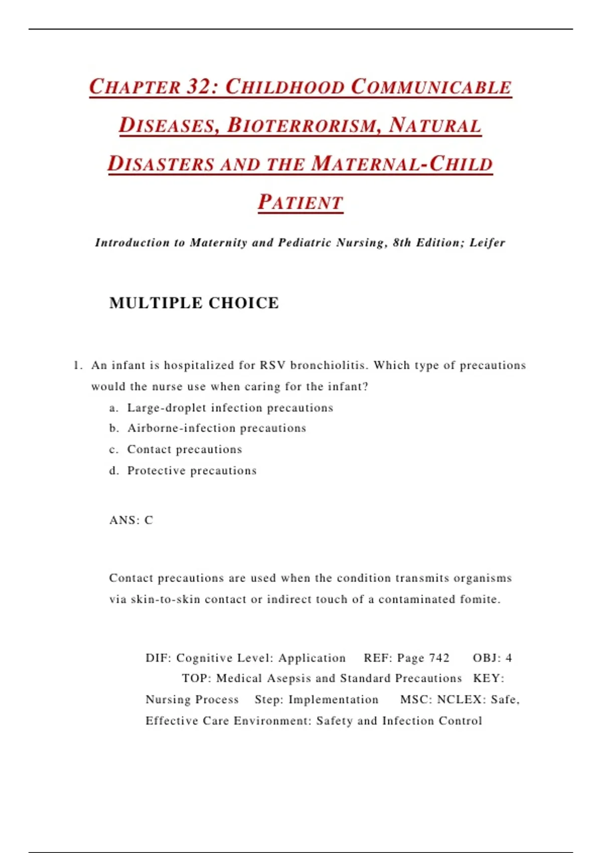 1. An infant is hospitalized for RSV bron chiolitis. Which t ype of precautions