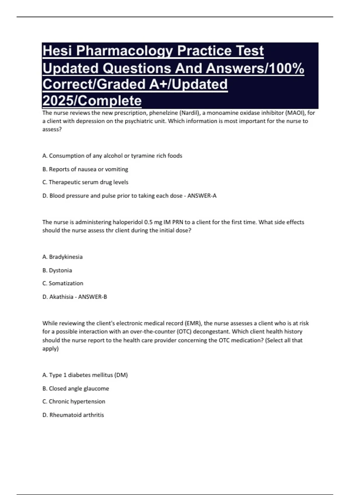 Hesi Pharmacology Practice Test Updated Questions And Answers/100% Correct/Graded A+/Updated 2025/Complete