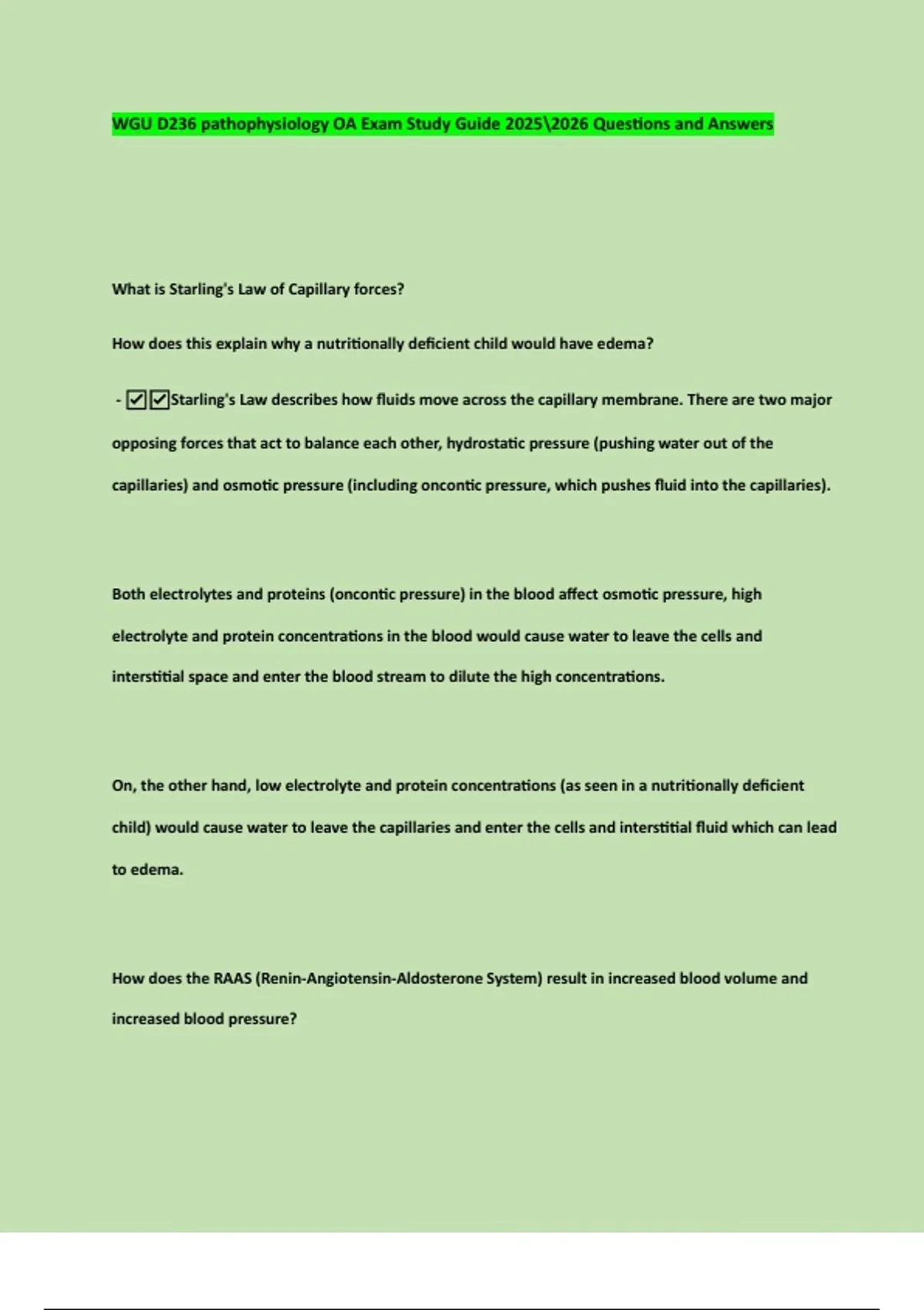 This document is a comprehensive study guide for the WGU D236 Pathophysiology OA exam. It summarizes key concepts, disease mechanisms, and clinical correlations across major systems including cardiovascular, respiratory, renal, endocrine, immune, and gastrointestinal. The guide is structured to help students review efficiently and prepare thoroughly for exam questions, making it a reliable resource for mastering core pathophysiology content.