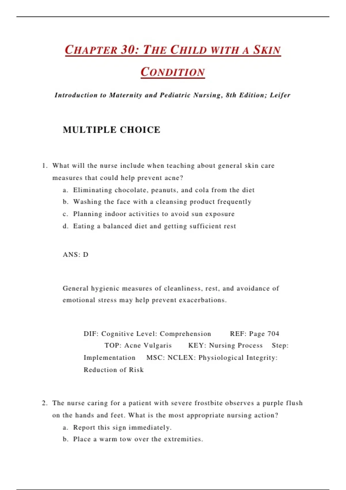 MULTIPLE CHOICE 1. What will the nurse include when teaching about general skin care measures that could help prevent acne? a. Eliminating chocolate, peanuts, and cola from the diet b. Washing the face with a cleansing product frequently c. Planning indoor activities to avoid sun exposure d. Eating a balanced diet and getting sufficient rest ANS: D General hygienic measures of cleanliness, rest, and avoidance of emotional stress may help prevent exacerbations. DIF: Cognitive Level: Comprehension REF: Page 704 TOP: Acne Vulgaris KEY: Nursing Process Step: Implementation MSC: NCLEX: Physiological Integrity: Reduction of Risk 2. The nurse caring for a patient with severe frostbite observes a purple flush on the hands and feet. What is the most appropriate nursing action? a. Report this sign immediately. b. Place a warm tow over the extremities. c. Gently sponge with cool water. d. Medicate for pain. ANS: D A purple flush indicates the return of sensation and causes extreme pain. DIF: Cognitive Level: Application REF: Page 717 TOP: Frostbite KEY: Nursing Process Step: Implementation MSC: NCLEX: Physiological Integrity: Basic Care and Comfort 3. A child is brought to the emergency department with burns on the face and chest. What is the nurses first priority? a. Assess respiratory status. b. Administer pain medication. c. Remove clothing. d. Insert a Foley catheter.