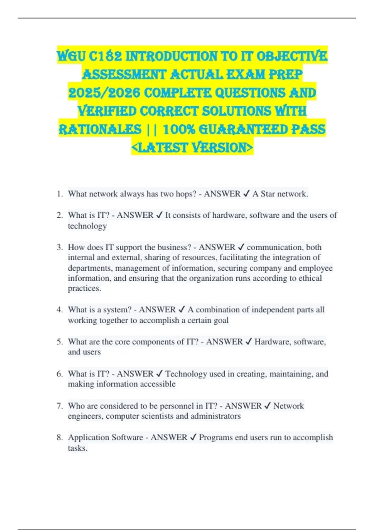 WGU C182 Introduction to IT OBJECTIVE ASSESSMENT ACTUAL EXAM PREP 2025/2026 COMPLETE QUESTIONS AND VERIFIED CORRECT SOLUTIONS WITH RATIONALES || 100% GUARANTEED PASS LATEST VERSION 1. What network always has two hops? - ANSWER A Star network. 2. What is IT? - ANSWER It consists of hardware, software and the users of technology 3. How does IT support the business? - ANSWER communication, both internal and external, sharing of resources, facilitating the integration of departments, management of information, securing company and employee information, and ensuring that the organization runs according to ethical practices. 4. What is a system? - ANSWER A combination of independent parts all working together to accomplish a certain goal 5. What are the core components of IT? - ANSWER Hardware, software, and users 6. What is IT? - ANSWER Technology used in creating, maintaining, and making information accessible 7. Who are considered to be personnel in IT? - ANSWER Network engineers, computer scientists and administrators 8. Application Software - ANSWER Programs end users run to accomplish tasks. 9. Productivity Software - ANSWER Application software used to aid in productivity. I.E. Presentation software, word processor, spreadsheets. 10. System Software - ANSWER Consists of programs that make up the OS and directly support system itself. **Includes services or DAEMONS 11. Server Software - ANSWER Works with hardware to provide network service. 12. Local Application - ANSWER Software stored on an individual computer. 13. Intranet - ANSWER A LAN that uses IP. Used to communicate within organization. 14. Cloud Computing - ANSWER Allows organization to access resources/app anywhere, anytime. Beneficial because an org. may access resources it may not normally have. 15. Operating Systems - ANSWER Allows a user to easily access hardware/software, required to maintain computer environment. 16. Kernel - ANSWER Core component of OS. Loads when computer first boots Sits on top of hardware, is interface b/w hardware and software. 17. Device Drivers - ANSWER Interface b/w OS and hardware. 18. Shell - ANSWER Interface for user, often personalized. The shell provides access to the kernel. I.E. The GUI will translate mouse motions into calls to kernel/routines. Desktop elements include shortcuts, windows theme, menus, background. 19. Services (Daemons) - ANSWER OS programs that start when OS is loaded. They run in the background and wait for an event to initiate. 20. Utility Programs - ANSWER Allow user to monitor system performance. 21. Web Server - ANSWER Role is to respond to HTTP requests. *Most HTTP requests are for HTML docs, but could include any web accessible resource. It's all combined into the URL. **APACHE is most popular web server-can execute scripts for dynamic pages, use security mechanisms, log request for trend tracking. 22. Number of steps in Strategic Risk Analysis - ANSWER 5 steps 23. Strategic Risk Analysis step 1 - ANSWER Define information assets 24. Strategic Risk Analysis step 2 - ANSWER Identify vulnerabilities of each asset 25. Strategic Risk Analysis step 3 - ANSWER risk assessment of each threat 26. Strategic Risk Analysis step 4 - ANSWER determine how to handle each risk 27. Strategic Risk Analysis step 5 - ANSWER create and enact policies 28. number of phases in project planning - ANSWER four phases 29. Project planning phase 1 - ANSWER Initiating: Problem definition, resource allocation and risk assessment 30. Project planning phase 2 - ANSWER Planning: Organize objective and activities, estimate time and costs 31. Project planning phase 3 - ANSWER Executing the plan and controlling the Project: project manager tracks the progress of the project with variance reports, status reports, resource allocation reports. 32. Project planning phase 4 - ANSWER Closing: each team writes a final report that details the processes and outcomes 33. Scope creep - ANSWER adding to the scope of a project during phase 3, puts project at risk. 34. SDLC - ANSWER Software development life cycle, 6 Steps 35. SDLC step #1 - ANSWER Preliminary Investigation: cost and benefit analysis of new system are weighed 36. SDLC step #2 - ANSWER Analysis: Develop understanding of system requirements for end user needs, address security concerns, asses accessibility concerns 37. SDLC step #3 - ANSWER Logical design: modeling the new system using flow charts and diagrams 38. SDLC step #4 - ANSWER Physical Design: laying out the system in physical environment 39. SDLC step #5 - ANSWER Implementation: Alpha and Beta Testing , User acceptance then system deployment 40. SDLC step #6 - ANSWER Maintenance: modifications and corrections are made 41. Describing the future aspirations of the organization is known as the _______ of the organization. - ANSWER Vision 42. Translating the organization's philosophy into specific, measurable outcomes that the organization plans to achieve are known as _______. - ANSWER Goals 43. _____________ is the application of knowledge, skills, and techniques to execute projects effectively and efficiently. - ANSWER Project Management 44. How many phases are there in project management? - ANSWER 4: Initiation -- Planning -- Executing & Controlling -- Closing