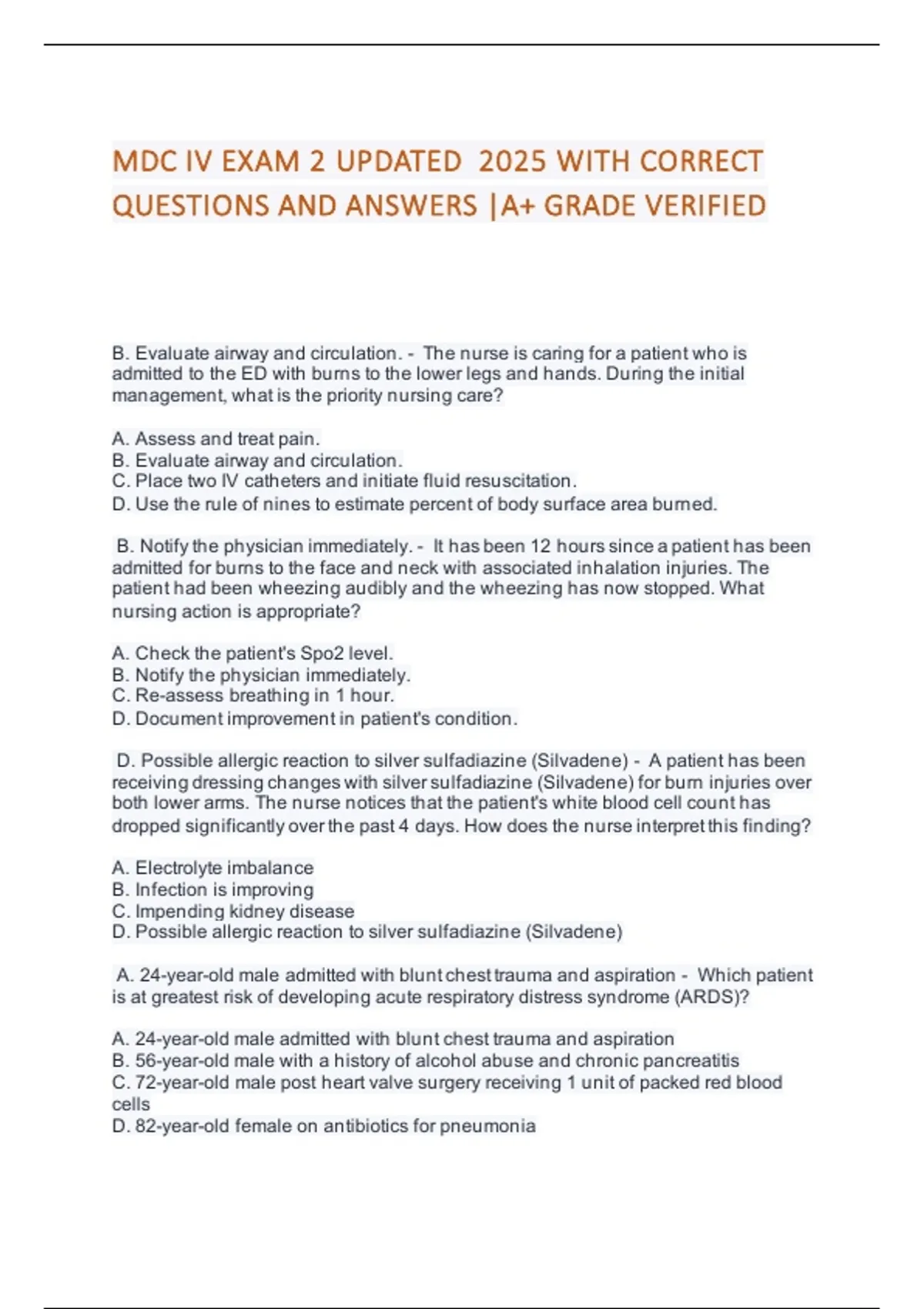 MDC IV EXAM 2 UPDATED 2025 WITH CORRECT QUESTIONS AND ANSWERS |A+ GRADE VERIFIED B. Evaluate airway and circulation. - The nurse is caring for a patient who is admitted to the ED with burns to the lower legs and hands. During the initial managemen