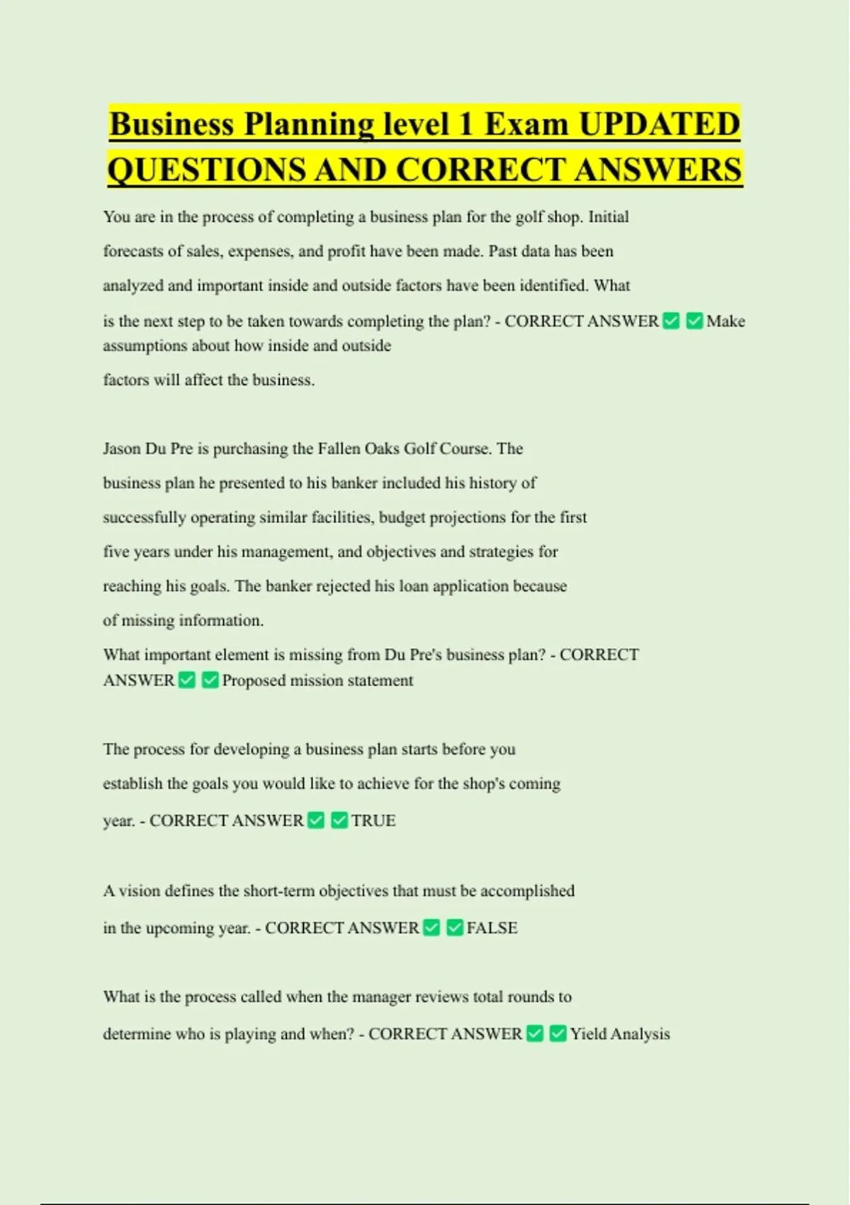 Business Planning level 1 Exam UPDATED QUESTIONS AND CORRECT ANSWERS You are in the process of completing a business plan for the golf shop. Initial forecasts of sales, expenses, and profit have been made. Past data has been analyzed and important inside and outside factors have been identified. What is the next step to be taken towards completing the plan? - CORRECT ANSWER assumptions about how inside and outside factors will affect the business. Jason Du Pre is purchasing the Fallen Oaks Golf Course. The business plan he presented to his banker included his history of successfully operating similar facilities, budget projections for the first five years under his management, and objectives and strategies for reaching his goals. The banker rejected his loan application because of missing information. What important element is missing from Du Pre's business plan? - CORRECT ANSWER Proposed mission statement The process for developing a business plan starts before you establish the goals you would like to achieve for the shop's coming year. - CORRECT ANSWER TRUE A vision defines the short-term objectives that must be accomplished in the upcoming year. - CORRECT ANSWER FALSE What is the process called when the manager reviews total rounds to determine who is playing and when? - CORRECT ANSWER Yield Analysis Make