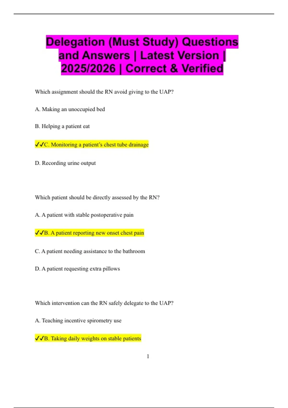 Delegation (Must Study) Questions and Answers | Latest Version | 2025/2026 | Correct & Verified Which assignment should the RN avoid giving to the UAP? A. Making an unoccupied bed B. Helping a patient eat C. Monitoring a patient’s chest tube drainage D. Recording urine output Which patient should be directly assessed by the RN? A. A patient with stable postoperative pain B. A patient reporting new onset chest pain C. A patient needing assistance to the bathroom D. A patient requesting extra pillows Which intervention can the RN safely delegate to the UAP? A. Teaching incentive spirometry use B. Taking daily weights on stable patients 2 C. Adjusting oxygen therapy settings D. Assessing nutritional intake Which responsibility cannot be delegated to an LPN? A. Administering oral medications B. Giving subcutaneous insulin C. Performing the first assessment after admission D. Reinforcing wound care instructions Which activity is appropriate for the UAP during shift change? A. Explaining medication side effects B. Evaluating a patient’s pain C. Stocking supplies in patient rooms D. Adjusting IV pump settings Which action should be performed by the RN rather than delegated? A. Feeding a confused patient B. Interpreting laboratory results 3 C. Assisting a patient to stand up D. Taking vital signs on a stable patient Which task is appropriate for delegation to an LPN? A. Administering intramuscular vaccines B. Completing discharge teaching C. Adjusting ventilator settings D. Performing a full nursing assessment Which activity is safe to delegate to the UAP? A. Evaluating pain relief after medication B. Explaining side effects of a new prescription C. Administering a tube feeding D. Obtaining vital signs on a stable patient Which task requires the RN’s direct involvement instead of delegation? A. Assisting a patient with a shower B. Collecting a urine specimen 4 C. Assessing lung sounds after nebulizer treatment D. Transporting a patient to radiology Which intervention can the LPN perform? A. Performing an admission assessment B. Administering intramuscular injections C. Interpreting lab results and changing care plan D. Developing discharge teaching Which activity can be delegated to the UAP during morning care? A. Assessing for skin breakdown B. Evaluating a patient’s fall risk C. Helping a patient with oral hygiene D. Teaching a patient how to use a cane Which patient should the RN assign to an experienced LPN? A. A patient requiring chemotherapy infusion B. A patient with stable hypertension needing oral medication 5 C. A patient admitted with acute stroke D. A patient requiring initial diabetes education