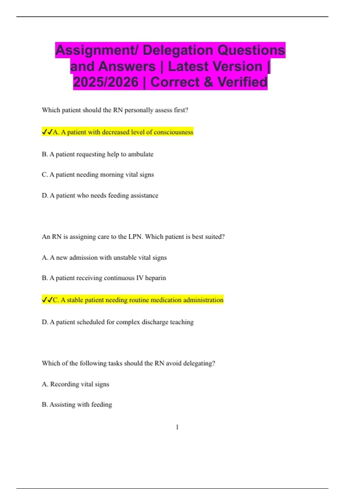 Assignment/ Delegation Questions and Answers | Latest Version | 2025/2026 | Correct & Verified Which patient should the RN personally assess first? A. A patient with decreased level of consciousness B. A patient requesting help to ambulate C. A patient needing morning vital signs D. A patient who needs feeding assistance An RN is assigning care to the LPN. Which patient is best suited? A. A new admission with unstable vital signs B. A patient receiving continuous IV heparin C. A stable patient needing routine medication administration D. A patient scheduled for complex discharge teaching Which of the following tasks should the RN avoid delegating? A. Recording vital signs B. Assisting with feeding 2 C. Assessing a patient’s risk for falls D. Ambulating a stable patient A nurse needs to delegate during a busy shift. Which task is most appropriate for a UAP? A. Administering a flu vaccine B. Providing perineal care C. Adjusting oxygen flow rate D. Interpreting a blood glucose result Which of the following patients should be assigned to the RN instead of the LPN? A. A patient experiencing new onset of chest pain B. A stable patient needing wound care C. A patient needing oral medication administration D. A stable patient requiring daily hygiene care Which task should be completed only by the RN? A. Developing the plan of care for a newly admitted patient B. Documenting oral intake 3 C. Assisting a patient to reposition in bed D. Collecting a urine specimen Which patient care activity is appropriate for delegation to the UAP? A. Monitoring a patient’s response to IV antibiotics B. Assisting with morning hygiene care C. Performing a neurological assessment D. Teaching about fall precautions Which assignment is appropriate for the LPN? A. Performing an admission assessment B. Administering intramuscular antibiotics C. Explaining discharge instructions D. Adjusting IV medication infusion The RN is supervising care. Which situation requires the RN’s direct intervention? A. A UAP attempting to teach a patient how to use an incentive spirometer B. A UAP ambulating a stable patient in the hall 4 C. An LPN giving oral medications to a stable patient D. A UAP providing assistance with feeding A nurse is deciding which task to delegate to a UAP. Which is most appropriate? A. Teaching a patient how to use a walker B. Assisting a patient with a bed bath C. Assessing a patient’s surgical incision