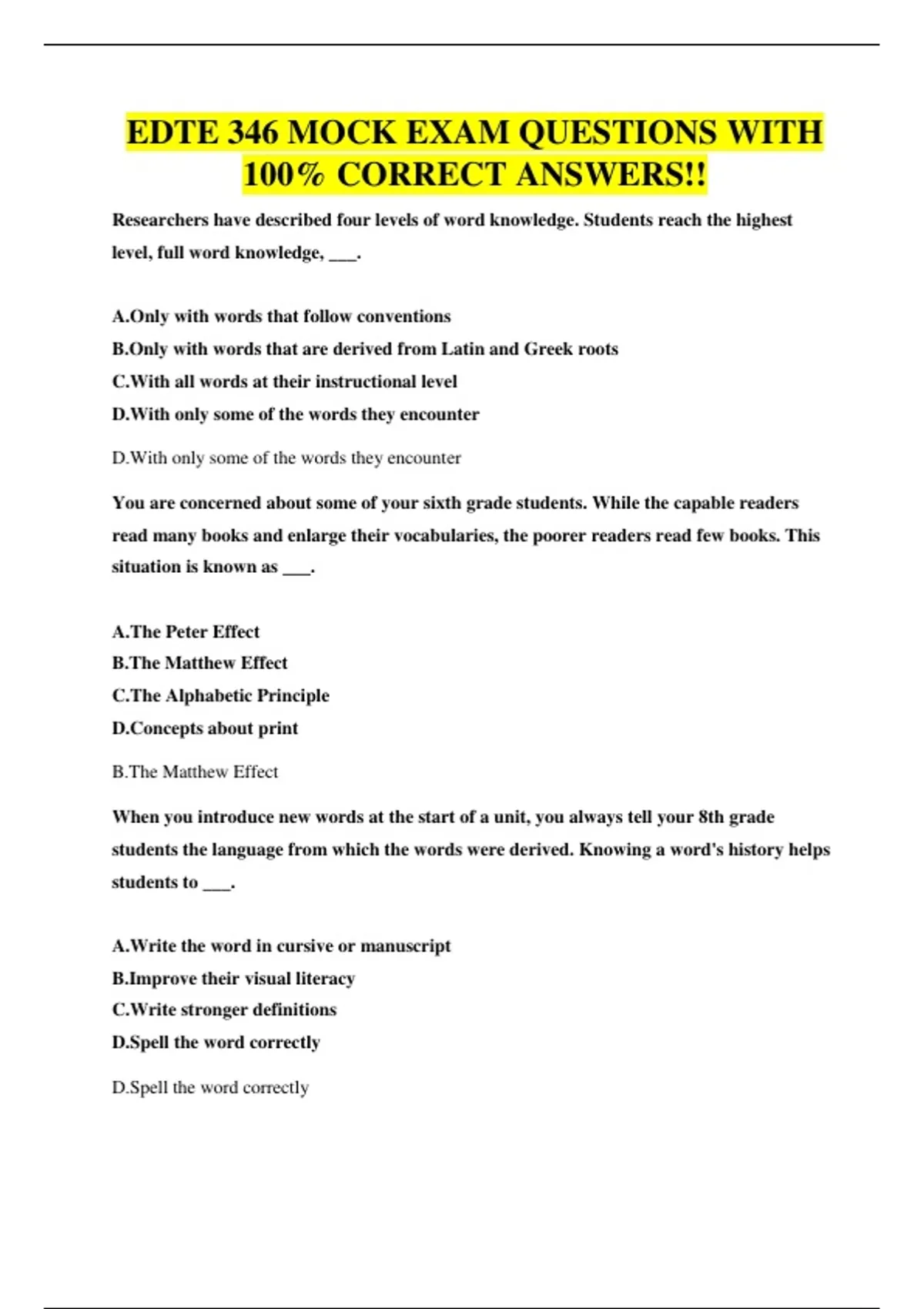 EDTE 346 MOCK EXAM QUESTIONS WITH