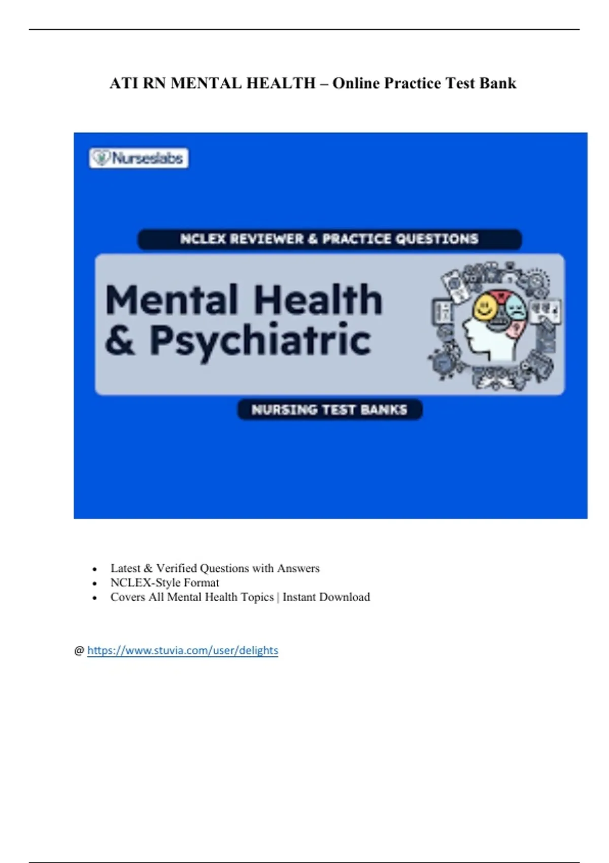 Ace your ATI RN Mental Health Online Practice Exam with this complete, verified test bank containing the latest questions and correct answers. This resource is designed for nursing students preparing for ATI Mental Health practice exams and proctored tests. All questions follow the NCLEX-style format to help you strengthen your test-taking skills. What’s Included: Complete ATI RN Mental Health Online Practice question bank Correct answers provided for each question NCLEX-style multiple choice & select-all-that-apply (SATA) Covers therapeutic communication, psychopharmacology, crisis intervention, patient care & more Printable & digital-friendly PDF Why Choose This Guide? 100% verified & updated to match ATI practice exams Saves you study time with direct, exam-focused content Helps boost scores & confidence before proctored exams Trusted by nursing students nationwide Perfect for: Nursing students preparing for ATI RN Mental Health Practice before ATI proctored exams Quick review for quizzes, finals, and NCLEX prep Download today and be fully prepared for your ATI RN Mental Health Online Practice Exam!