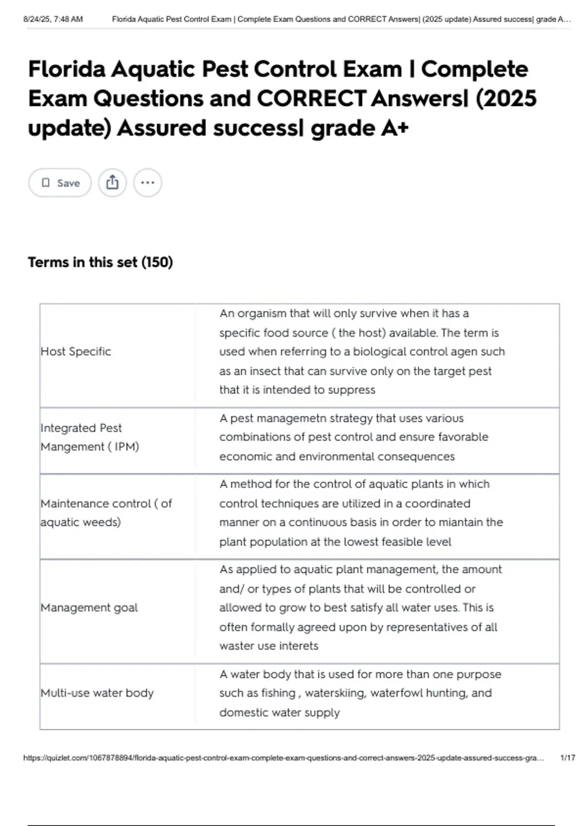 , 8/24/25, 7:48 AM Florida Aquatic Pest Control Exam | Complete Exam Questions and CORRECT Answers| (2025 update) Assured success| grade A…