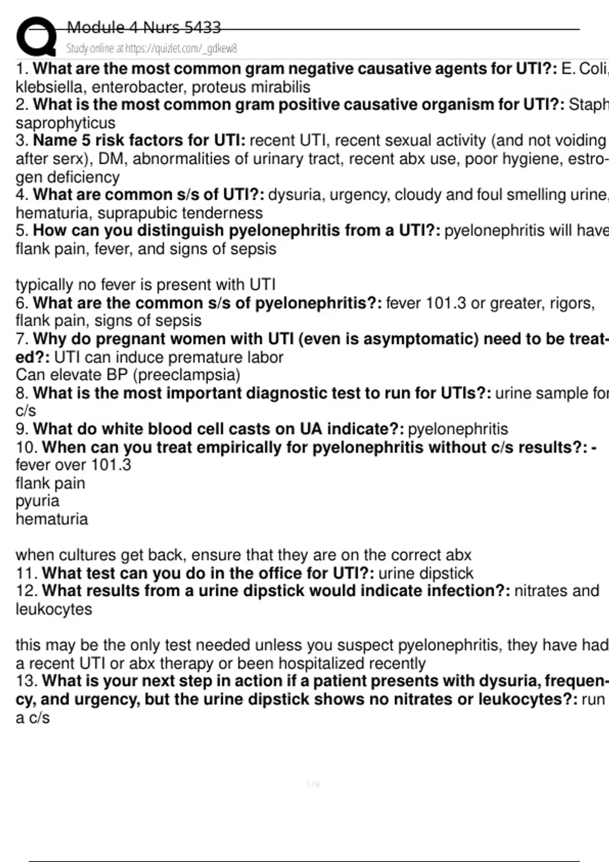 9. What do white blood cell casts on UA indicate?: pyelonephritis