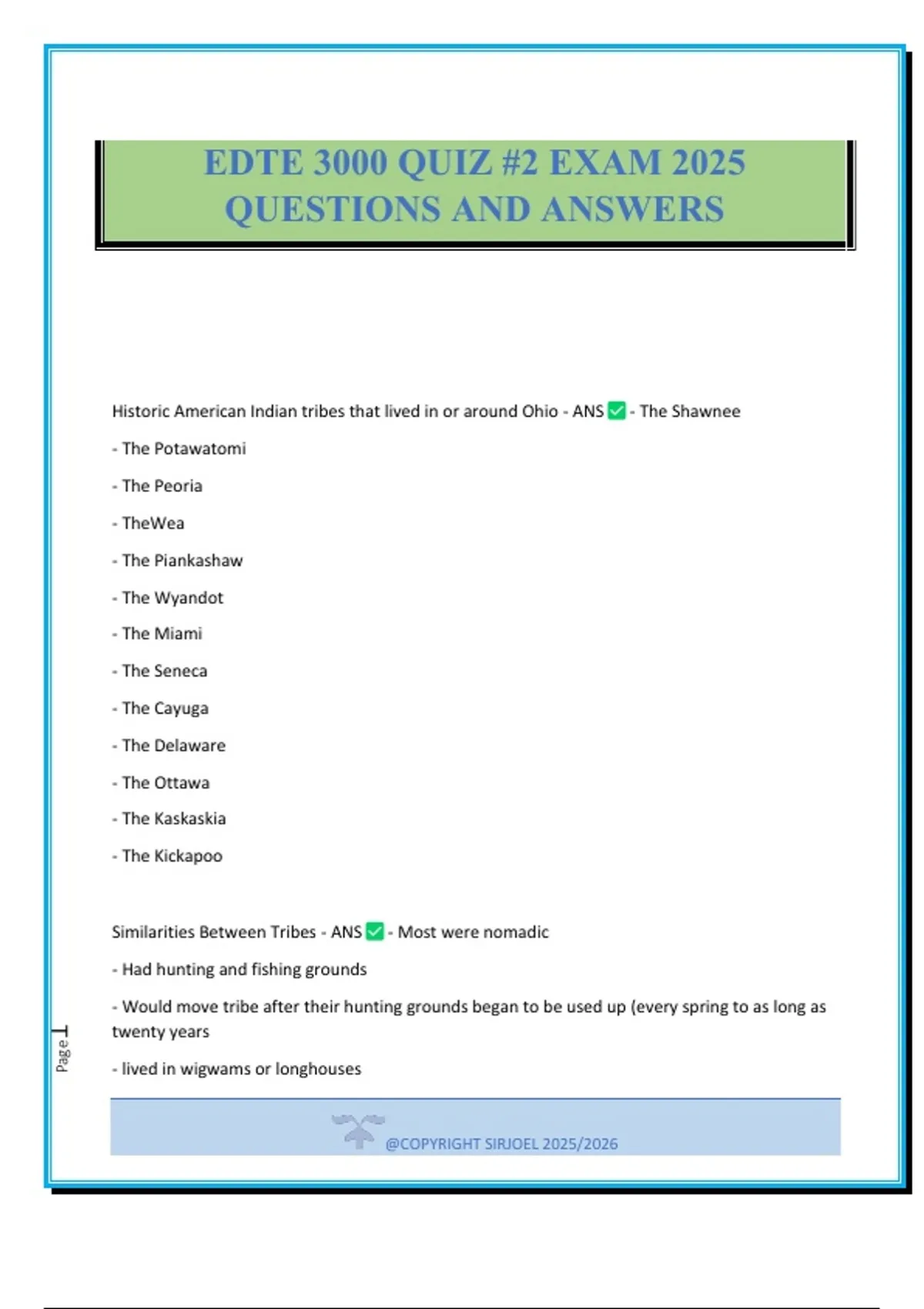 Historic American Indian tribes that lived in or around Ohio - ANS - The Shawnee - The Potawatomi - The Peoria - TheWea - The Piankashaw - The Wyandot - The Miami - The Seneca - The Cayuga - The Delaware - The Ottawa - The Kaskaskia - The Kickapoo Similarities Between Tribes - ANS - Most were nomadic - Had hunting and fishing grounds - Would move tribe after their hunting grounds began to be used up (every spring to as long as twenty years - lived in wigwams or longhouses EDTE 3000 QUIZ #2 EXAM 2025 QUESTIONS AND ANSWERS @COPYRIGHT SIRJOEL 2025/2026 Page2 - work was divided by men, women, and children - most men hunted - Women and children grew the three sisters (beans, maize, and squash) - All helped in building shelter and planting crops Tribe Differences - ANS - spoke different languages - Algonquian and Iroquoian - families were structured differently - Traditions and stories - Unique origin stories of how a tribe came to be - Celebrations hunting and fishing grounds - ANS A place where tribes hunt wild animals. wigwams - ANS - Cabins made with a wooden frame of curved poles and large pieces of tree bark and/or cattail reeds as walls. - lived here during warm weather Longhouses - ANS - Houses made to house several tribal families - Lived here during cold weather - had camp fires in the middle of the houses - Smoke holes in ceiling to act as chimneys Dialects - ANS A person's style of speaking spoken in a region or by a group of people Totems - ANS Sacred animals that symbolized a clan or group of familes @COPYRIGHT SIRJOEL 2025/2026 Page3 - Used by the Ojibwe tribe - Marrying inside of one's totem was very forbidden matrilineal - ANS When one traces their family through only their mother's side of the family, rather than through both their mother and father's sides. - seneca tribe was matrilineal - Seneca mothers could nominate chiefs and named everyone in their clan Pow-Wow - ANS - a celebration of Native American culture to pass traditions on to future generations - A sacred gathering that began in the 1800s. - involved dancing and drumming competitions -members dressed in bright regalia - Celebrated by Peoria & Potawatomi Regalia - ANS - De