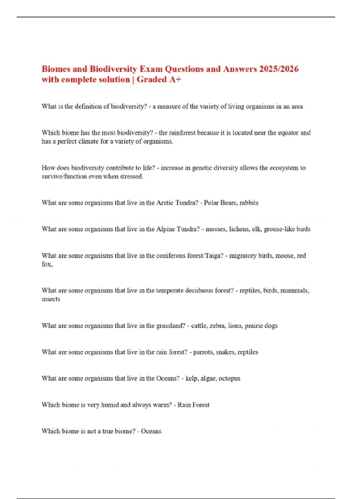 Biomes and Biodiversity Exam Questions and Answers 2025/2026 with complete solution | Graded A+