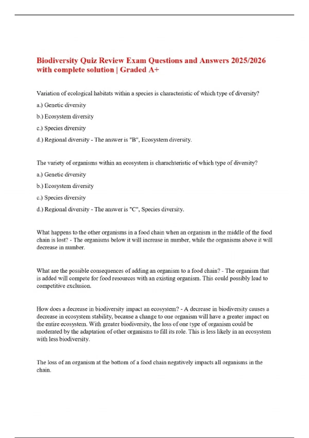 Biodiversity Quiz Review Exam Questions and Answers 2025/2026 with complete solution | Graded A+