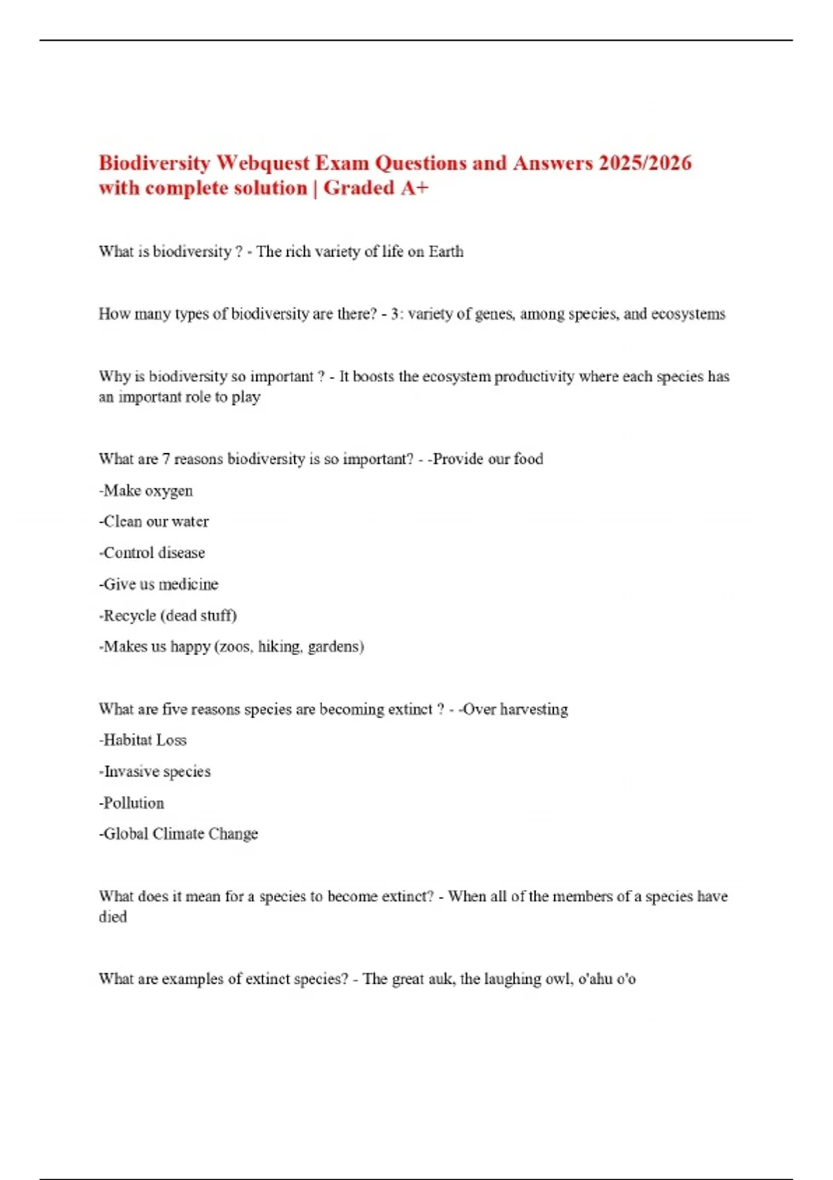Biodiversity Webquest Exam Questions and Answers 2025/2026 with complete solution | Graded A+