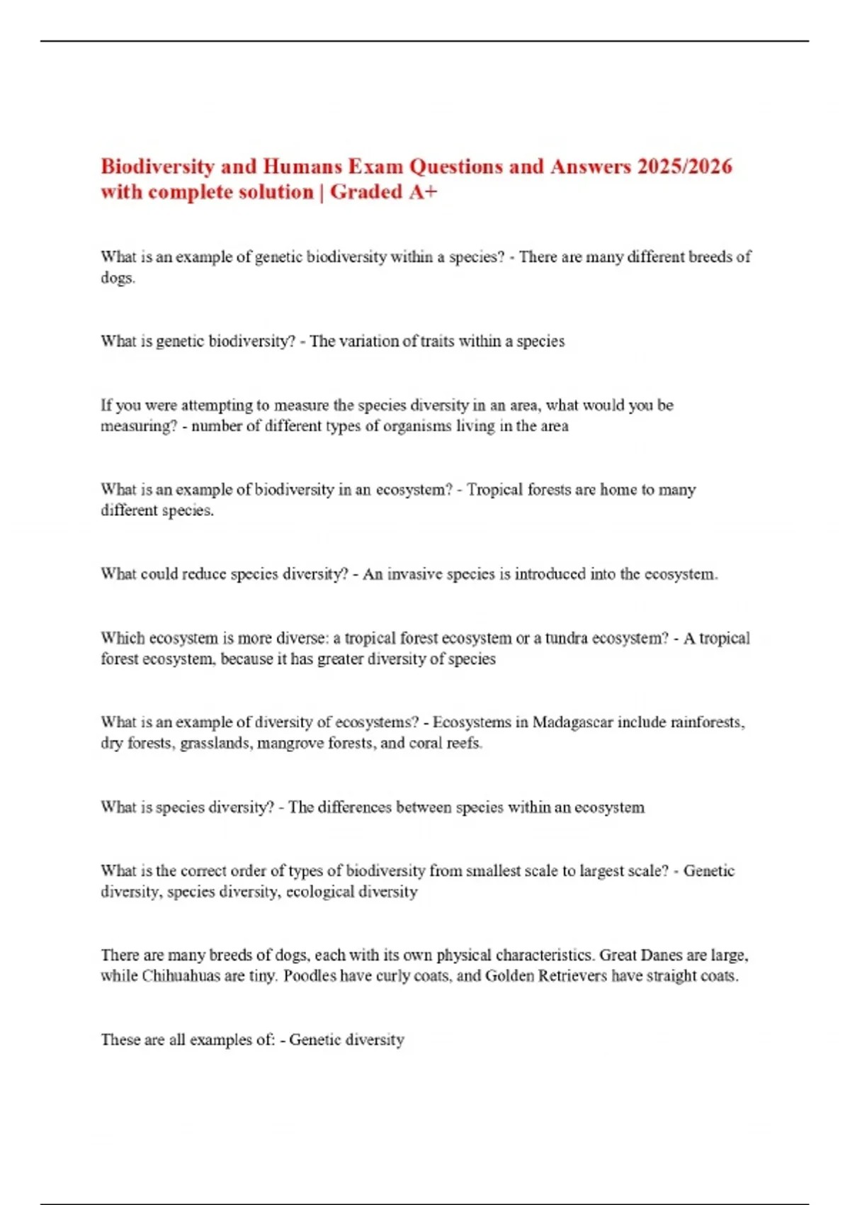 Biodiversity and Humans Exam Questions and Answers 2025/2026 with complete solution | Graded A+