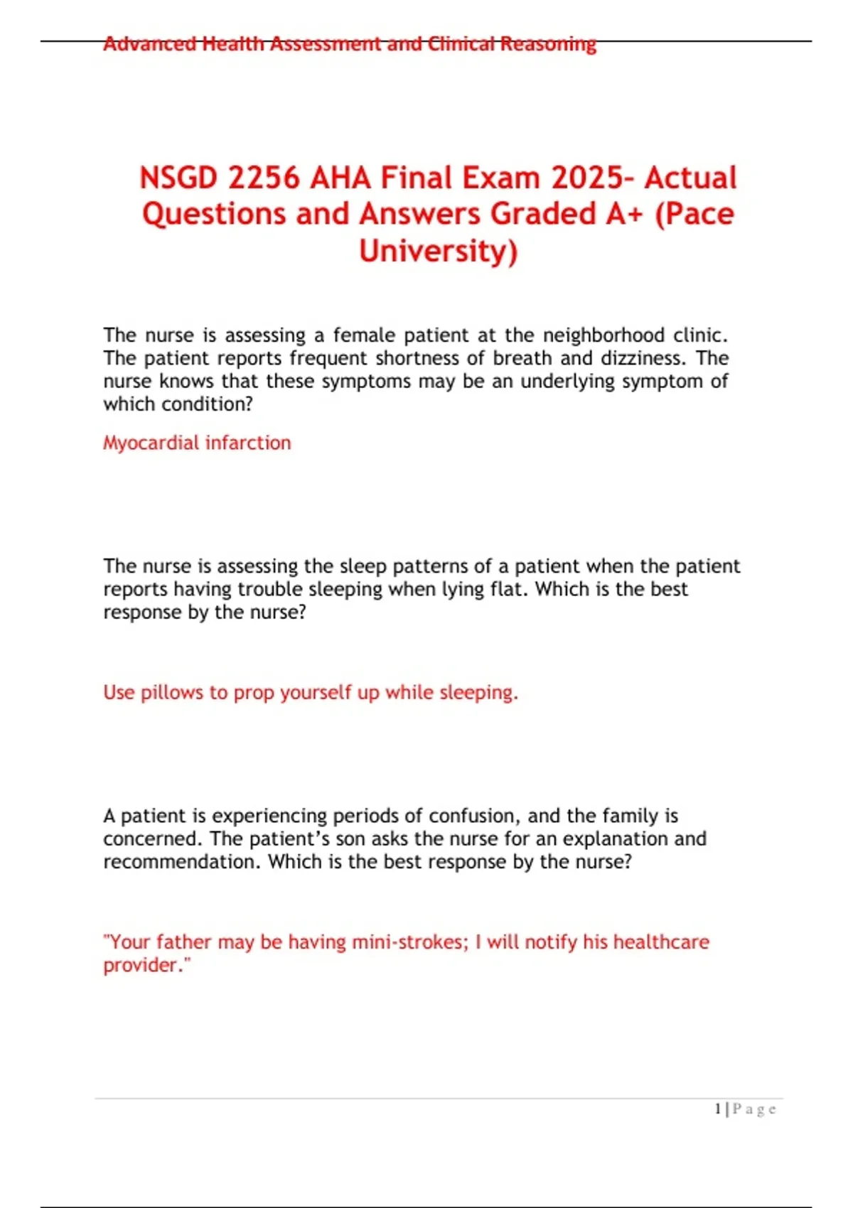 The NSGD 2256 AHA Final Exam 2025 resource includes accurate and frequently tested questions with verified answers, designed to help nursing students prepare with confidence. Covering essential AHA standards and clinical practice content, this exam prep boosts knowledge and test performance. Instantly available on Stuvia, it’s the perfect guide for acing the NSGD 2256 AHA final exam.