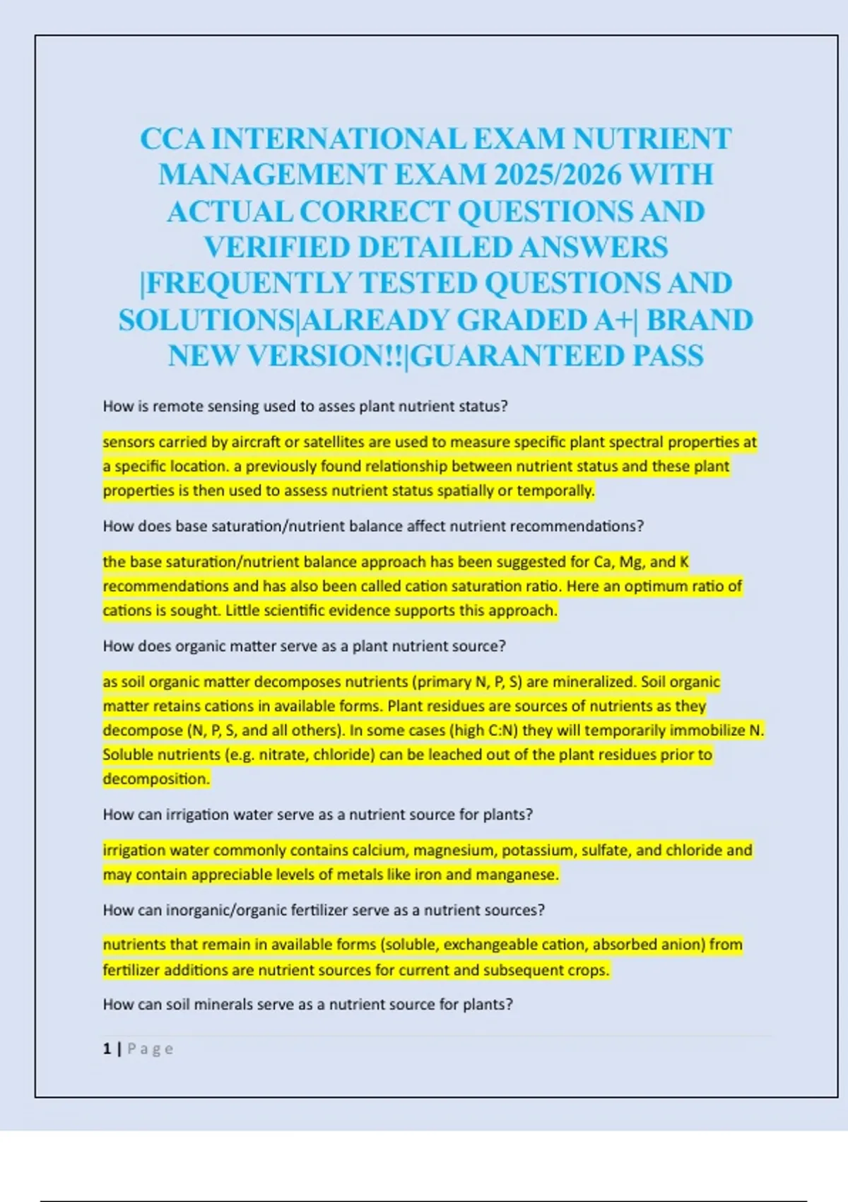 CCA INTERNATIONAL EXAM NUTRIENT MANAGEMENT EXAM 2025/2026 WITH ACTUAL CORRECT QUESTIONS AND VERIFIED DETAILED ANSWERS |FREQUENTLY TESTED QUESTIONS AND SOLUTIONS|ALREADY GRADED A+| BRAND NEW VERSION!!|GUARANTEED PASS
