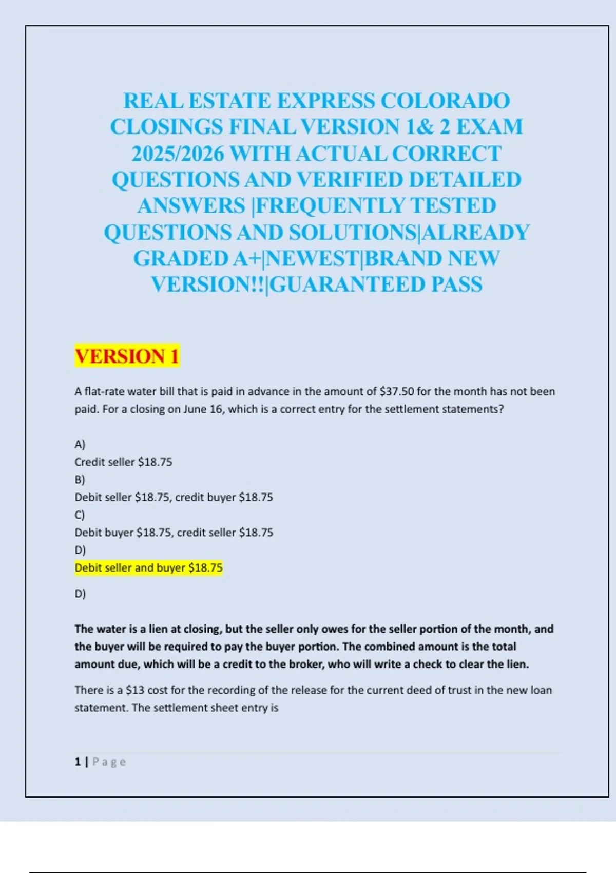 REAL ESTATE EXPRESS COLORADO CLOSINGS FINAL VERSION 1& 2 EXAM 2025/2026 WITH ACTUAL CORRECT QUESTIONS AND VERIFIED DETAILED ANSWERS |FREQUENTLY TESTED QUESTIONS AND SOLUTIONS|ALREADY GRADED A+|NEWEST|BRAND NEW VERSION!!|GUARANTEED PASS