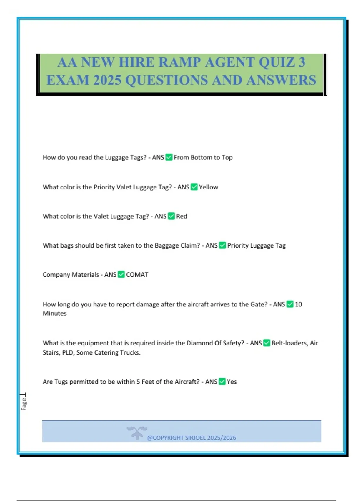 AA NEW HIRE RAMP AGENT QUIZ 3 EXAM 2025 QUESTIONS AND ANSWERS