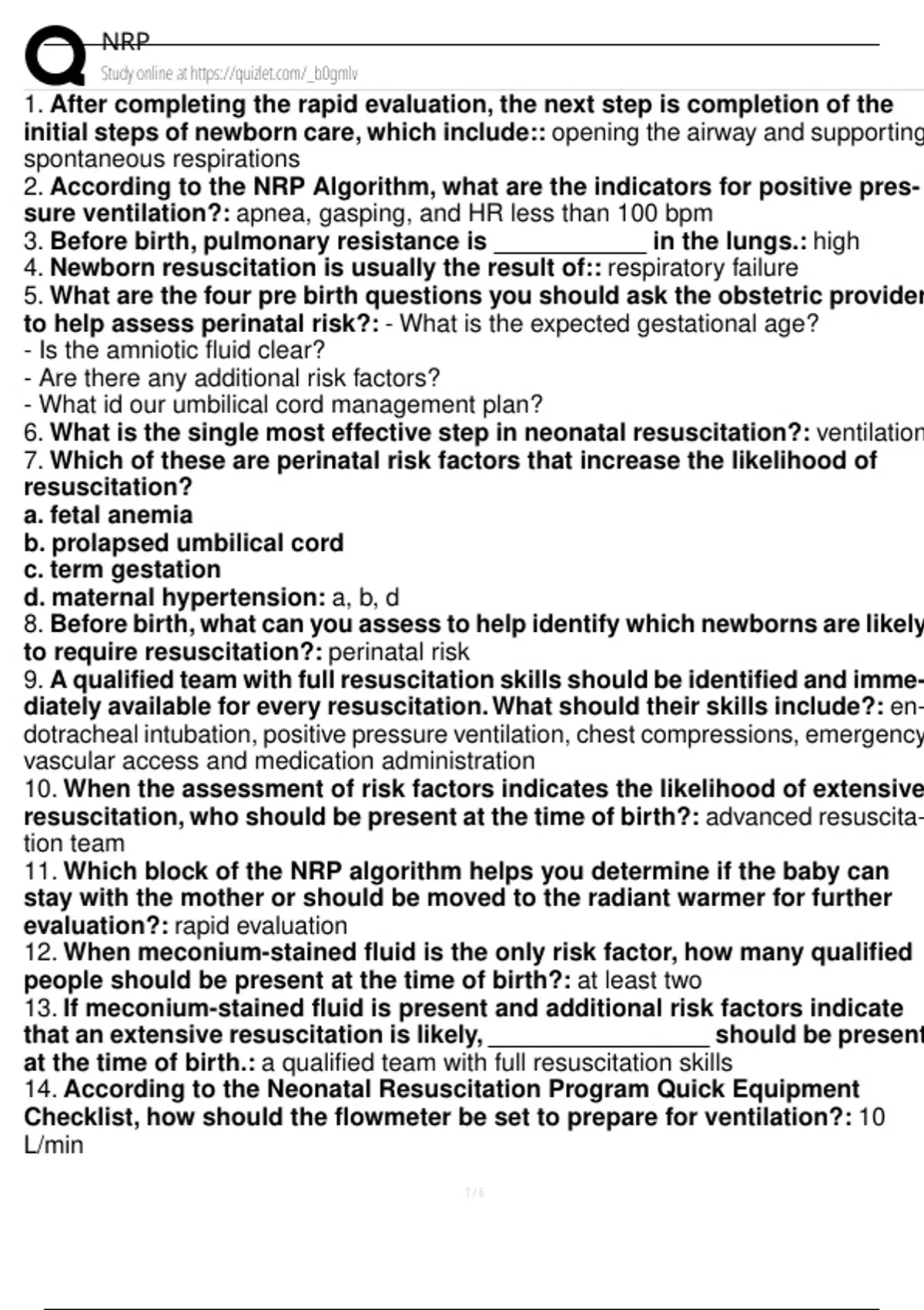 After completing the rapid evaluation, the next step is completion of the initial steps of newborn care, which include:: opening the airway and supporting spontaneous respirations 2. According to the NRP Algorithm, what are the indicators for positive pres- sure ventilation?: apnea, gasping, and HR less than 100 bpm 3. Before birth, pulmonary resistance is ___________ in the lungs.: high 4. Newborn resuscitation is usually the result of:: respiratory failure 5. What are the four pre birth questions you should ask the obstetric provider to help assess perinatal risk?: - What is the expected gestational age? - Is the amniotic fluid clear? - Are there any additional risk factors? - What id our um